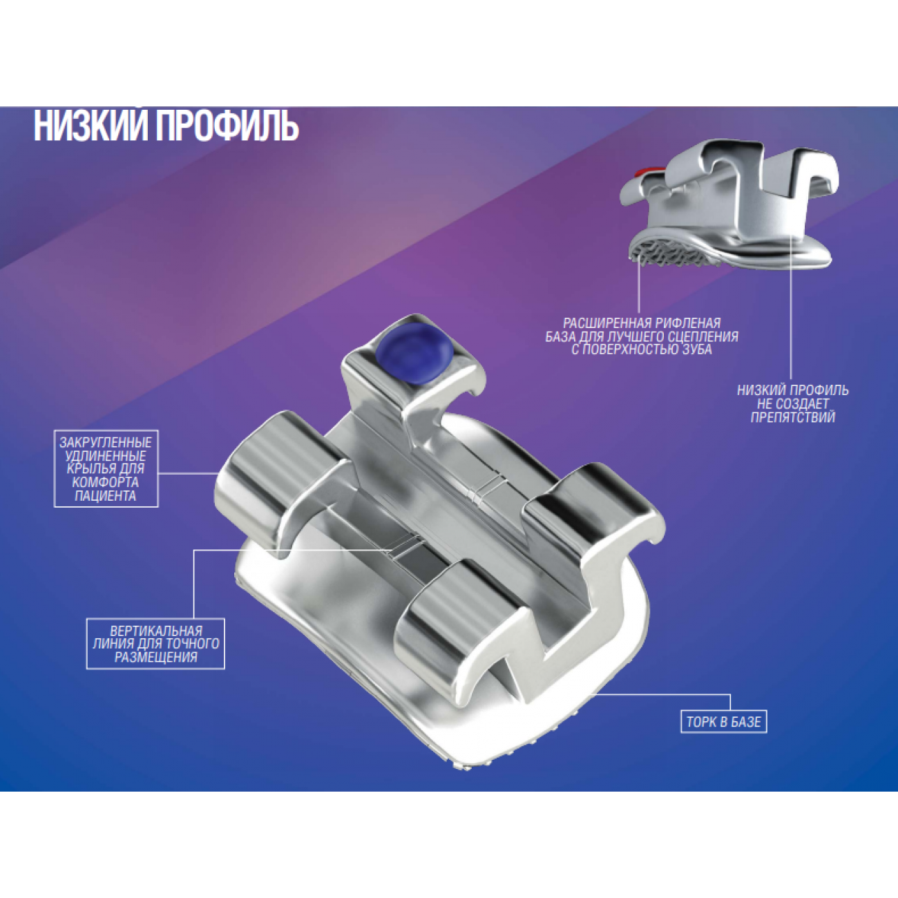 Имеют расширенную рифленую базу для лучшего сцепления с поверхностью зуба. Низкий профиль брекета не создает препятствий.