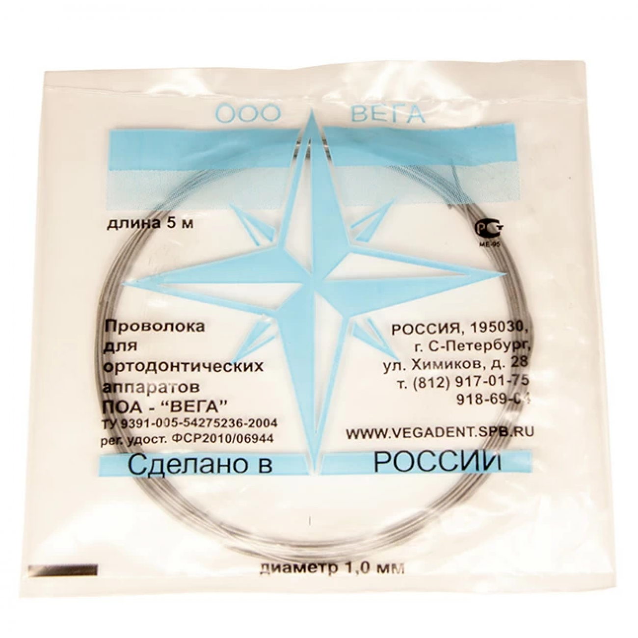 Проволока для изготовления ортодонтических аппаратов и кламмеров. Изготовлена из нержавеющей стали. Диаметр 1,0 мм, длина 5 м.