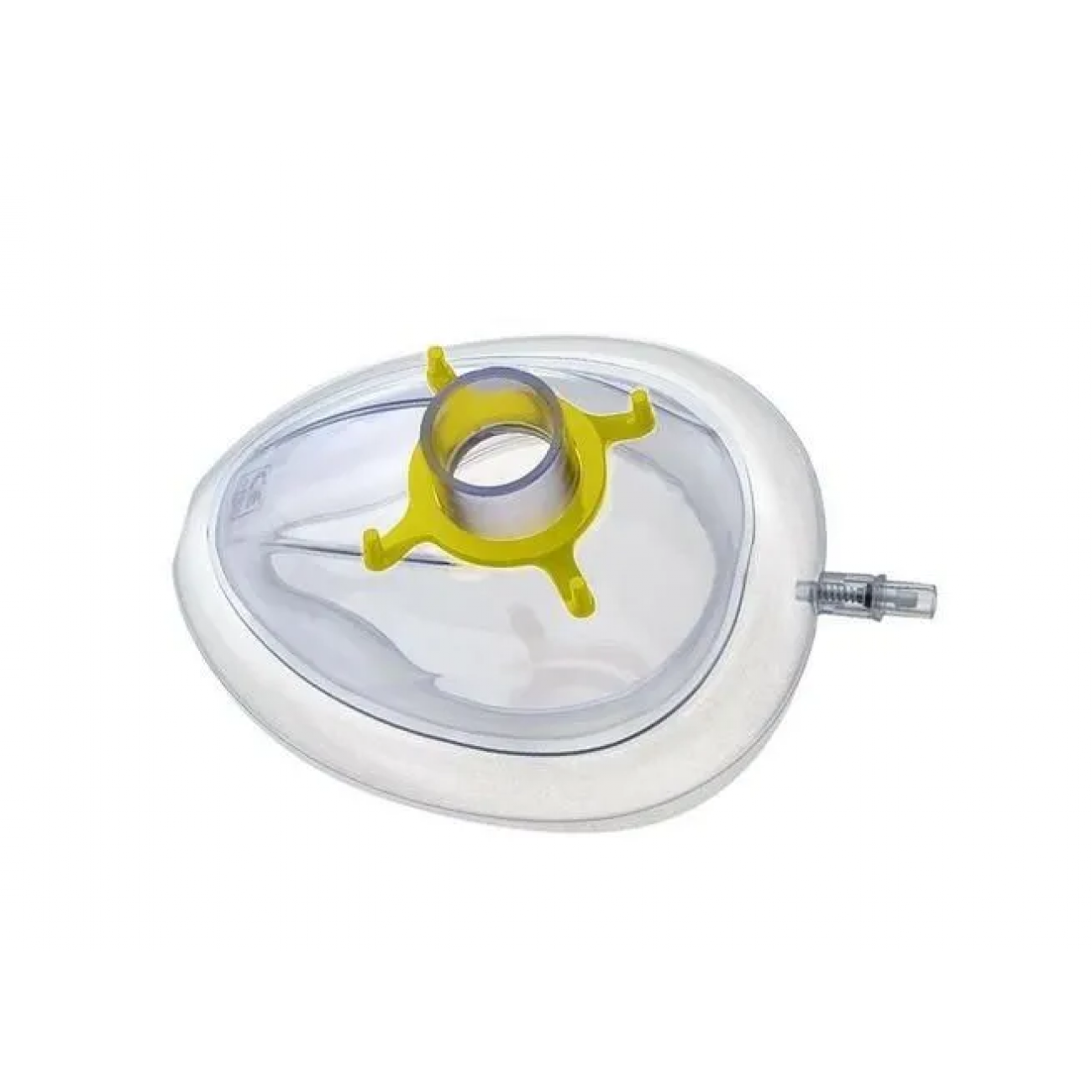 Маска лицевая анестезиологическая (наркозная) одноразового использования. Размер 2, разъем 22 F. Размер маски 81+-2 мм на 61+-2 мм. Изготавливается из прозрачного материала, что позволяет врачу контролировать состояние пациента во время наркоза. Товар делают из жесткого медицинского пластика с соблюдением анатомической формы. По периметру маски располагается удобная, наполненная воздухом манжета для комфортного надевания. В зоне подбородка на манжете имеется специальный клапан под шприц Луера. На каждом товаре имеется цветная маркировка, предназначенная для перекрестного крепления. Она располагается в месте разъема с дыхательным контуром. Маска стерильная и упакована в блистер.