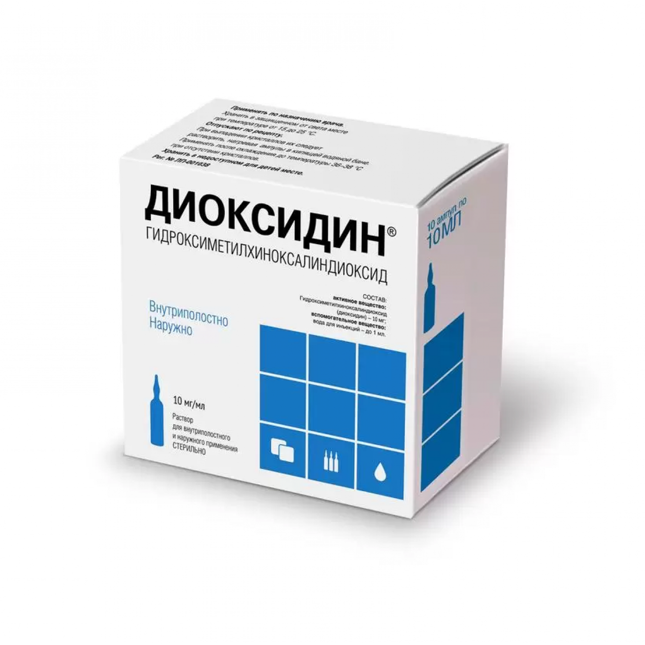 Действующее вещество: гидроксиметилхиноксалиндиоксид (диоксидин) – 10 мг