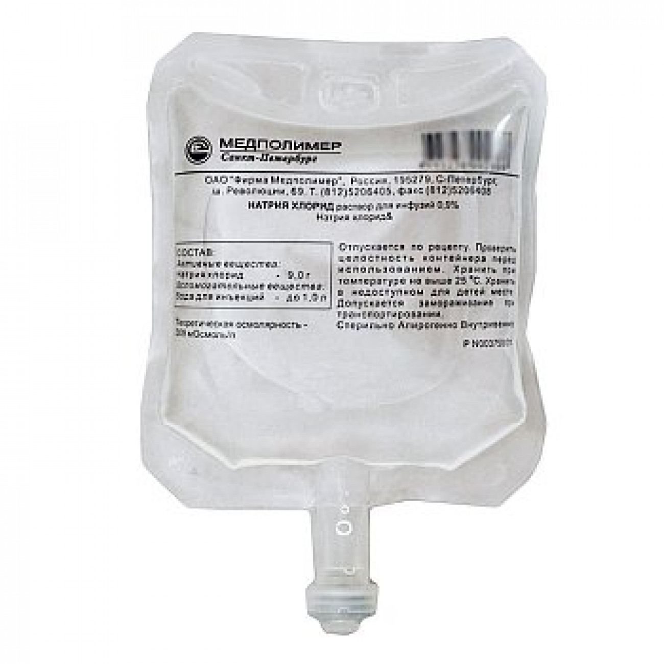 Самоспадающийся полимерный контейнер из многослойной полиолефиновой пленки, не содержит поливинилхлорид, с инъекционным портом типа SFС, с резиновой пробкой. Контейнер имеет один порт,