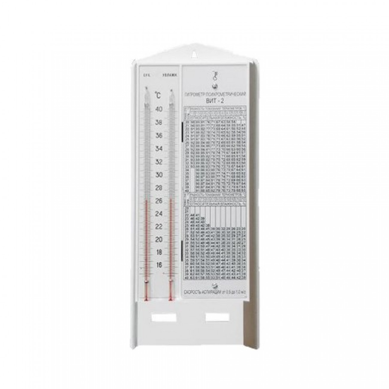 Конструкция модели психрометра ВИТ-2 схожа с гигрометром ВИТ-1.Основание из пластика, есть шкала с температурами и два капилляра. Один из них увлажняется тканевым фитилем. С внутренней стороны стоит питатель. Пластина со шкалой и таблица определения влажности металлические