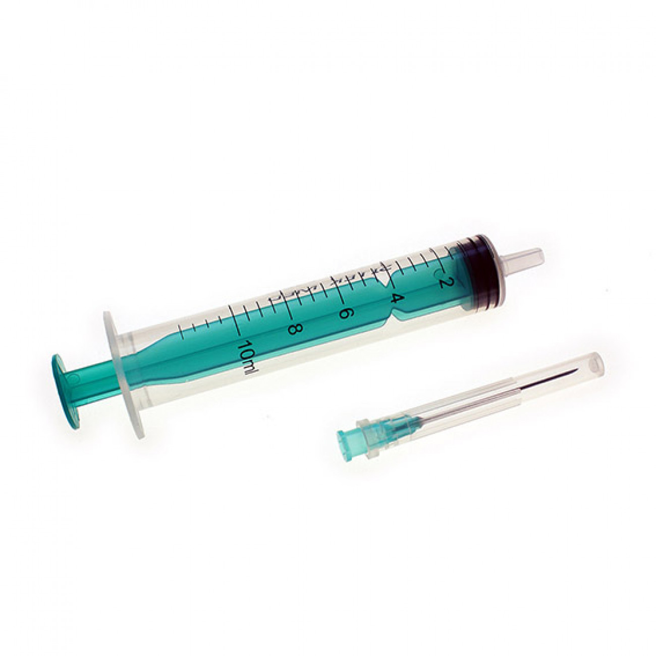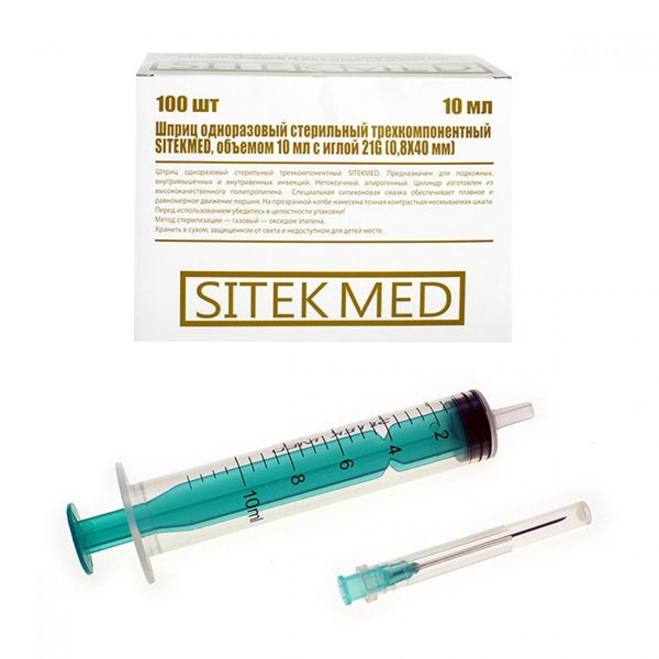 Трехкомпонентный шприц 10мл, индивидуально упакован в блистер, игла лежит рядом. Шприц имеет плавный ход поршня за счёт резиновой манжеты на поршне. Стальная игла inox AISI 304 тройной степени заточки с максимальным проникновением в кожу имеет силиконовое защитное покрытие и снижает болевые ощущения при уколе. На прозрачной герметичной колбе нанесена шкала несмываемой краской. Модифицированный упор для пальцев, имеющий выраженную ребристость, позволяет надежно удерживать шприц во время инъекции. Стерильная блистерная упаковка из нетоксичного материала обеспечивает видимость шприца до вскрытия упаковки и свидетельствует о ее целостности. Разъем luer-slip исключает размыкание шприц-игла. Особая форма резинового уплотнителя, благодаря идеальному положению на дне цилиндра, гарантирует введение полного объема лекарства. Изумрудный пластиковый поршень. Стерильно, апирогенно, нетоксично, одноразового применения.