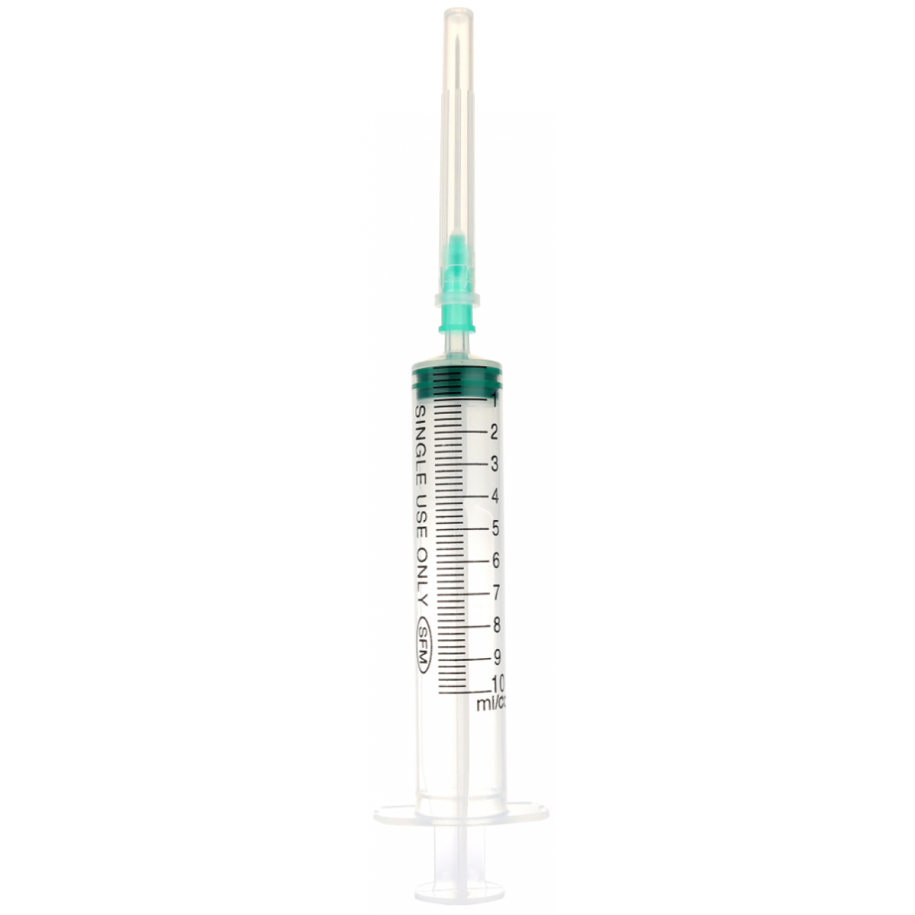 Шприцы трехкомпонентные одноразовые в аптечных упаковках поставляются с иглами. Шприцы применяют для выполнения подкожных, внутримышечных инъекций и других лечебно-диагностических мероприятий. Шприц состоит из трех частей: цилиндр, поршень, манжета на поршне. Трехкомпонентные шприцы объемом 10 мл изготовлены из специального полипропилена и стерильно упакованы. Безболезненность инъекции обуславливается легким скольжением поршня, без трения. Уплотнитель поршня не содержит латекс. Удерживающее кольцо на поршне предотвращает потерю медикамента, а точная градуировка на шприце позволяет легко считывать показания.