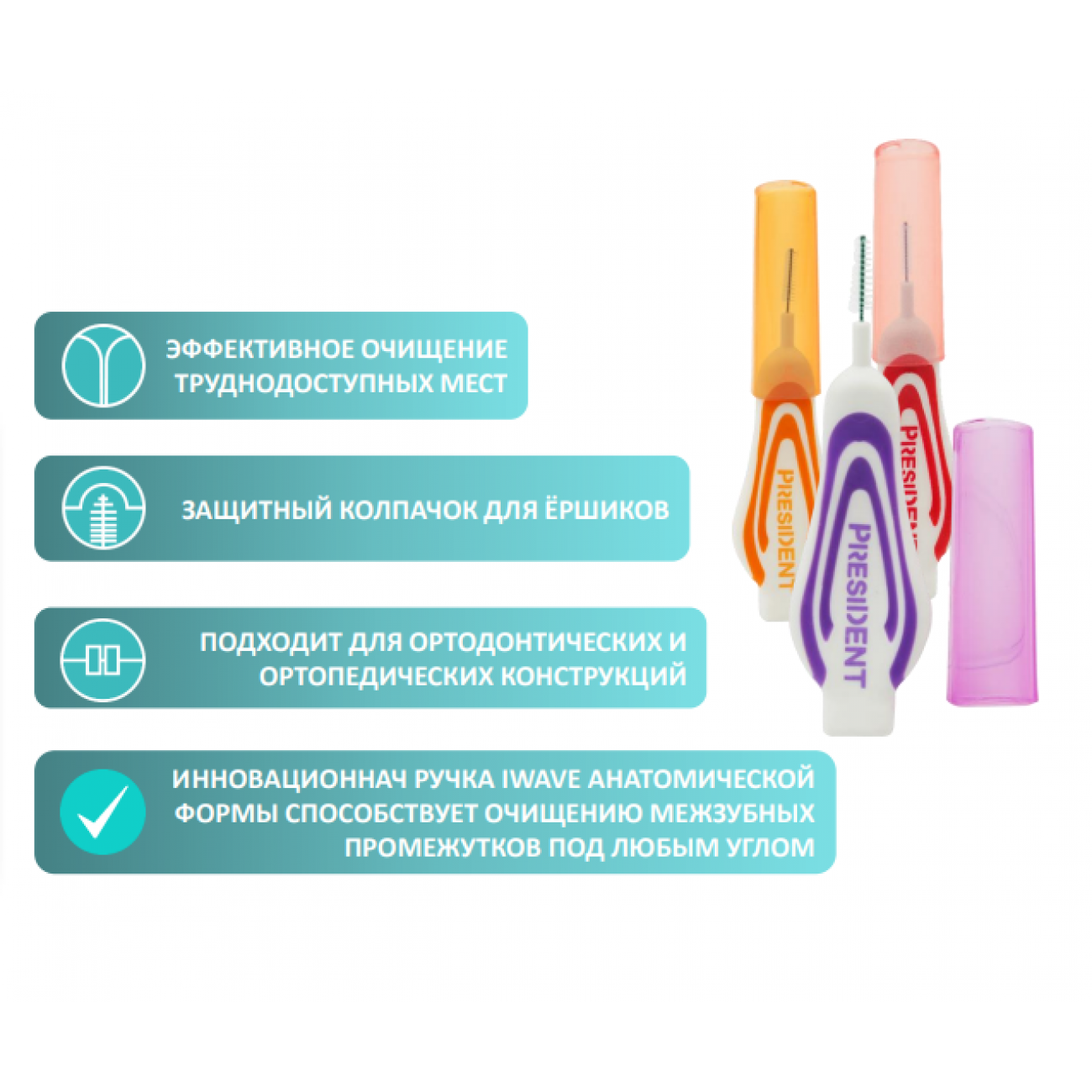 Межзубный ершик PRESIDENT PROFI с ручкой анатомической формы позволит эффективно очистить межзубные промежутки, ортодонтические и ортопедические конструкции под любым углом. Для удобной стерильной переноски ершики оснащены защитным колпачком.