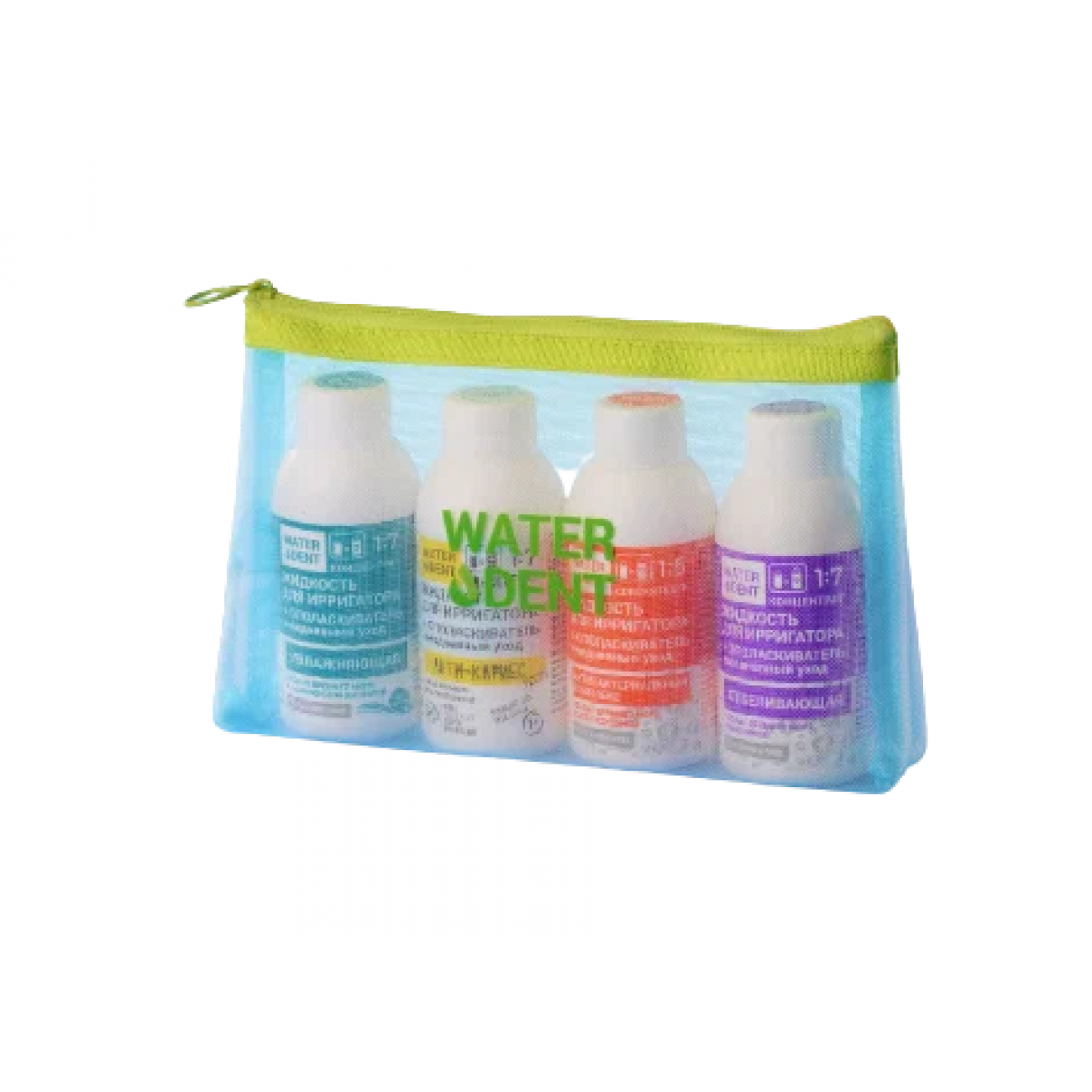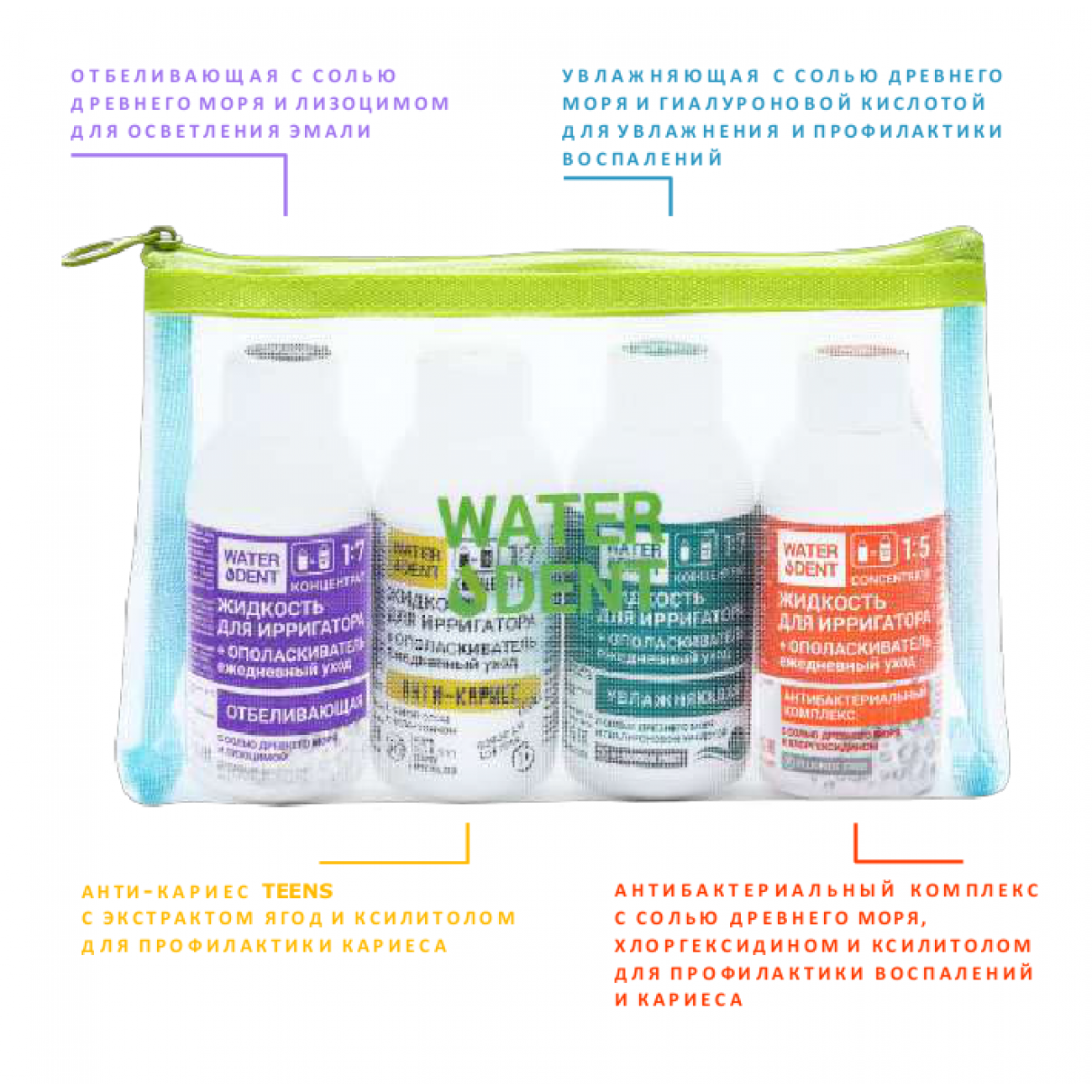 Удобно брать с собой в поездки, а также в качестве первого знакомства перед покупкой объемного формата 500 мл. Компактные жидкости для ирригатора + ополаскиватель в красивой брендированной косметичке WATERDENT: Антибактериальный комплекс с бишофитом, хлоргексидином и ксилитолом для профилактики воспалений и кариес. Отбеливающая с солью Древнего моря и лизоцимом для осветления эмали. Увлажняющая с солью Древнего моря и гиалуроновой кислотой для увлажнения и борьбы с сухостью. Анти-кариес Teens с экстрактом ягод и ксилитолом для профилактики кариеса. Подходит для всей семьи с 7 лет. Раствор для ирригатора необходимо разбавлять 1:7 = 800 мл из 100 мл готового продукта. Формат для путешествий