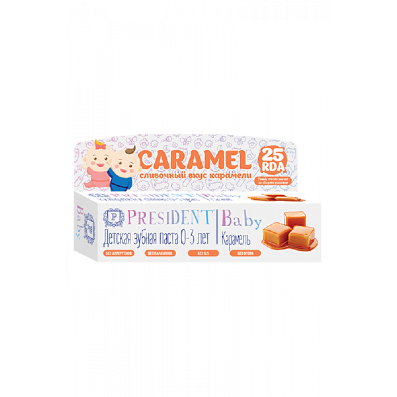 Детская зубная паста PRESIDENT Baby Caramel для самых маленьких: с появления первого зубика до 3 лет. Обеспечивает деликатный уход за нежными деснами малыша и молочными зубами. Сливочный карамельный вкус позволяет приучить ребенка к ежедневной гигиене полости рта и превращает чистку зубов в удовольствие.