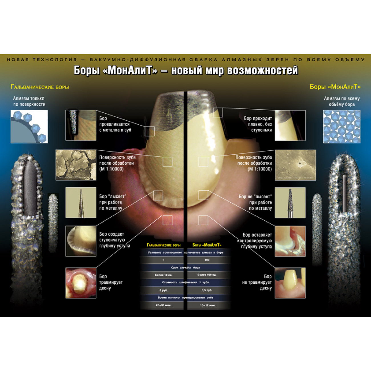 Боры МонАлит имеют более продолжительный срок службы по сравнению с алмазными инструментами, изготовленными гальваническим путем или спеканием.