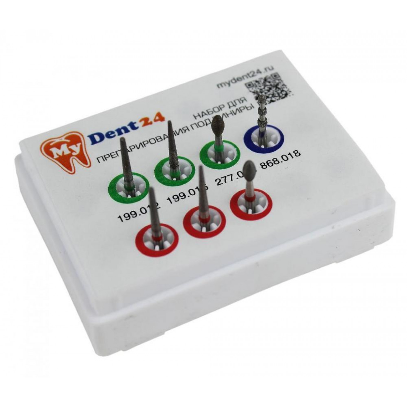 Набор для препарирования под виниры содержит 6 цельноалмазных и один гальванический (метчик) бор.
