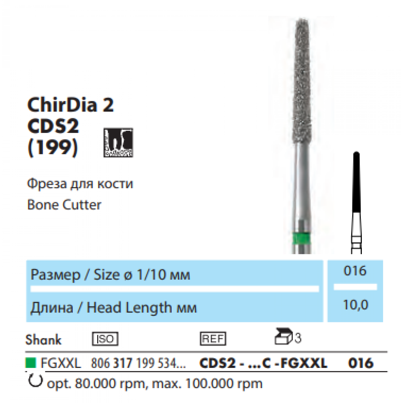 | Характеристики Бор Хирургический CDS2-016C-FGXXL форма конус | |