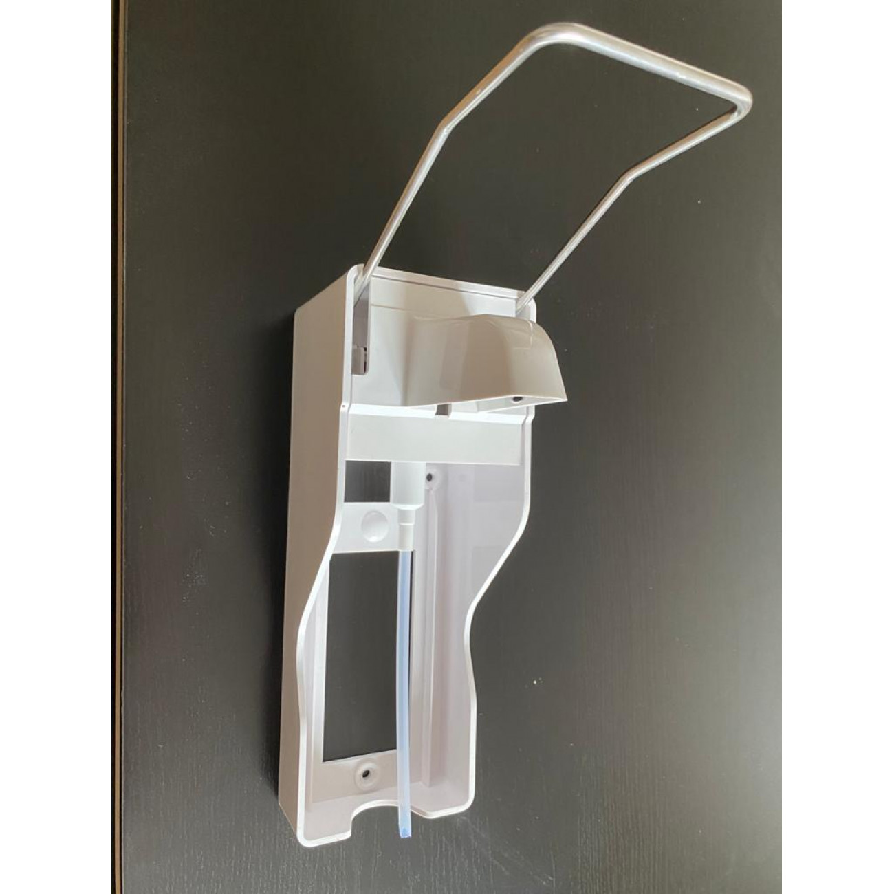 Благодаря длинному рычагу для локтевого нажатия избегается контаминация рук. При необходимости дозатор легко снимается и моется теплой водой. Насос выполненый из нержавеющей стали настроен на дозирование по 1,5 мл.