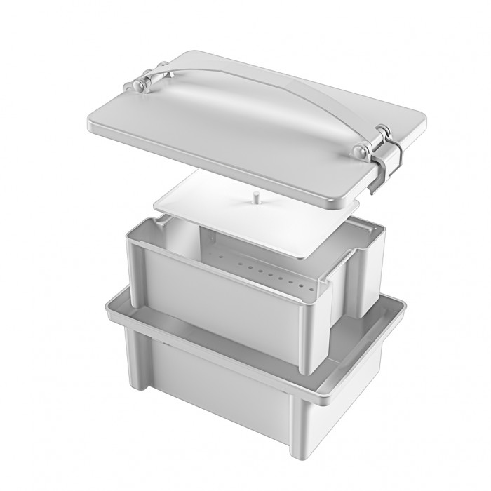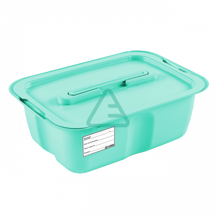 Контейнер имеет прямоугольную форму и состоит из прямоугольного корпуса-ванны, перфорированного поддона, пластины-гнета и крышки. В верхней части корпуса имеются специальные выемки для установки поддона с содержимым при стекании раствора. Пластина обеспечивает полное погружение в дезинфектант обрабатываемых изделий. Крышка имеет ручку для удобства переноски. Уплотнитель и защелки крышки обеспечивают плотное её прилегание к корпусу, исключают испарение и расплескивание дез.средств во время транспортировки.