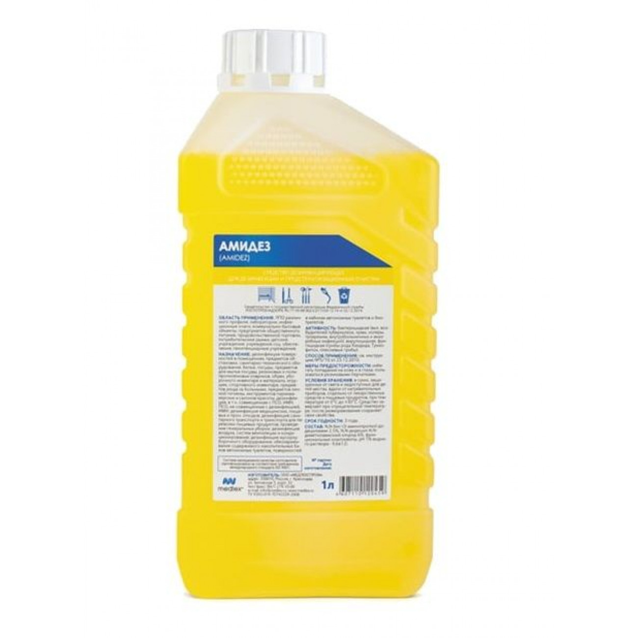 Дезинфицирующее средство Амидез содержит N,N-бис-(3-аминопропил) додециламина 2,5% и N,N-дидецил-N,N - диметиламмонийхлорида (ЧАС) 6%, а также функциональные компоненты и воду. рН 1% водного раствора средства 9,8±1,0.