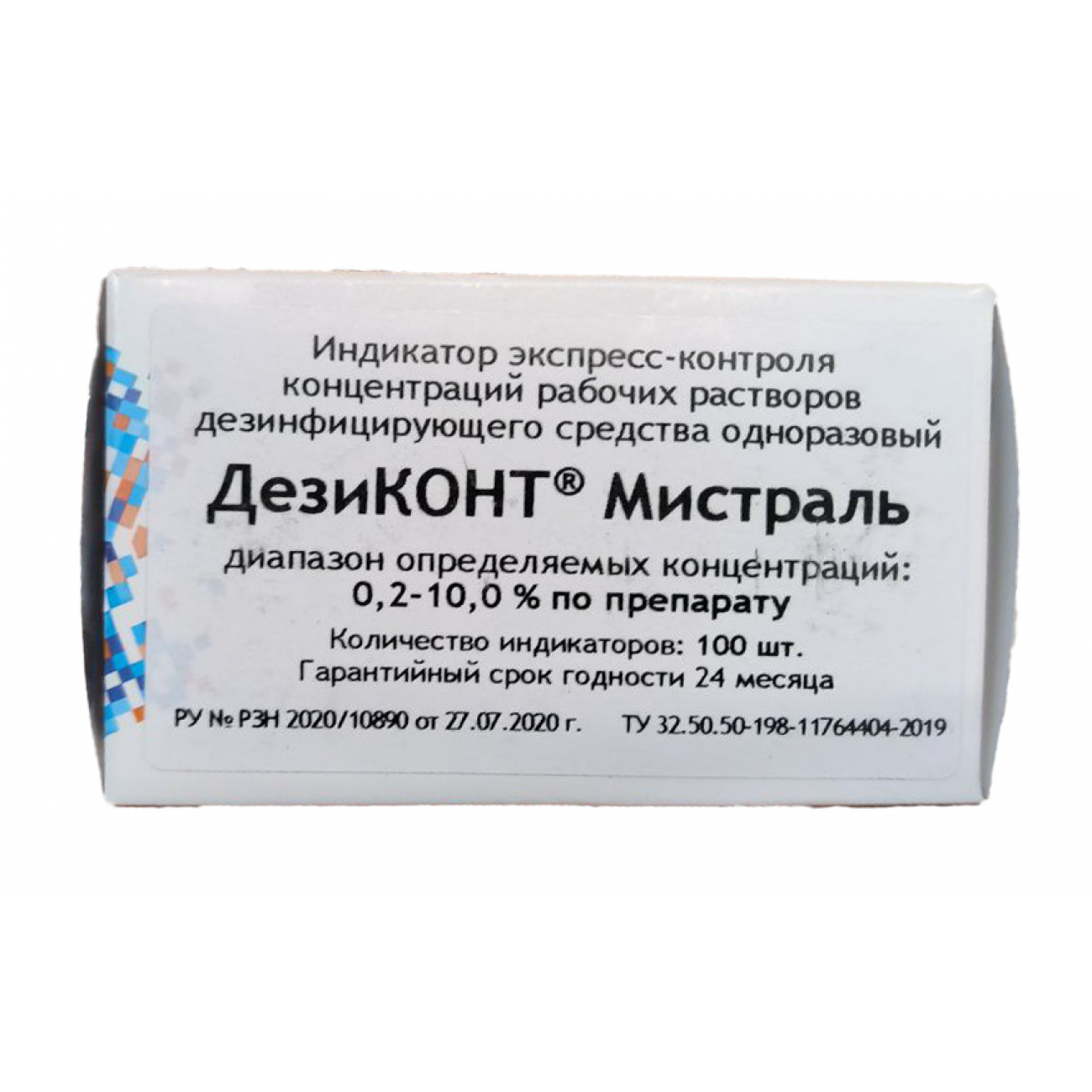 Полоски индикаторные могут быть предназначены для экспресс-контроля концентраций рабочих растворов дезинфицирующего средства 'Мистраль' в диапазоне концентраций от 0,3% до 2,0% по препарату. Время контроля не более 3 минут. Индикаторные полоски предназначены для персонала лечебно-профилактических учреждений, работников дезинфекционной и санитарно-эпидемиологической служб, а также других учреждений, имеющих право заниматься дезинфекционной деятельностью. Гарантийный срок не менее 18 месяцев. Поставляется в комплекте с журналом контроля концентраций рабочих растворов дезинфицирующих и стерилизующих средств. Комплект из 100 индикаторных полосок.