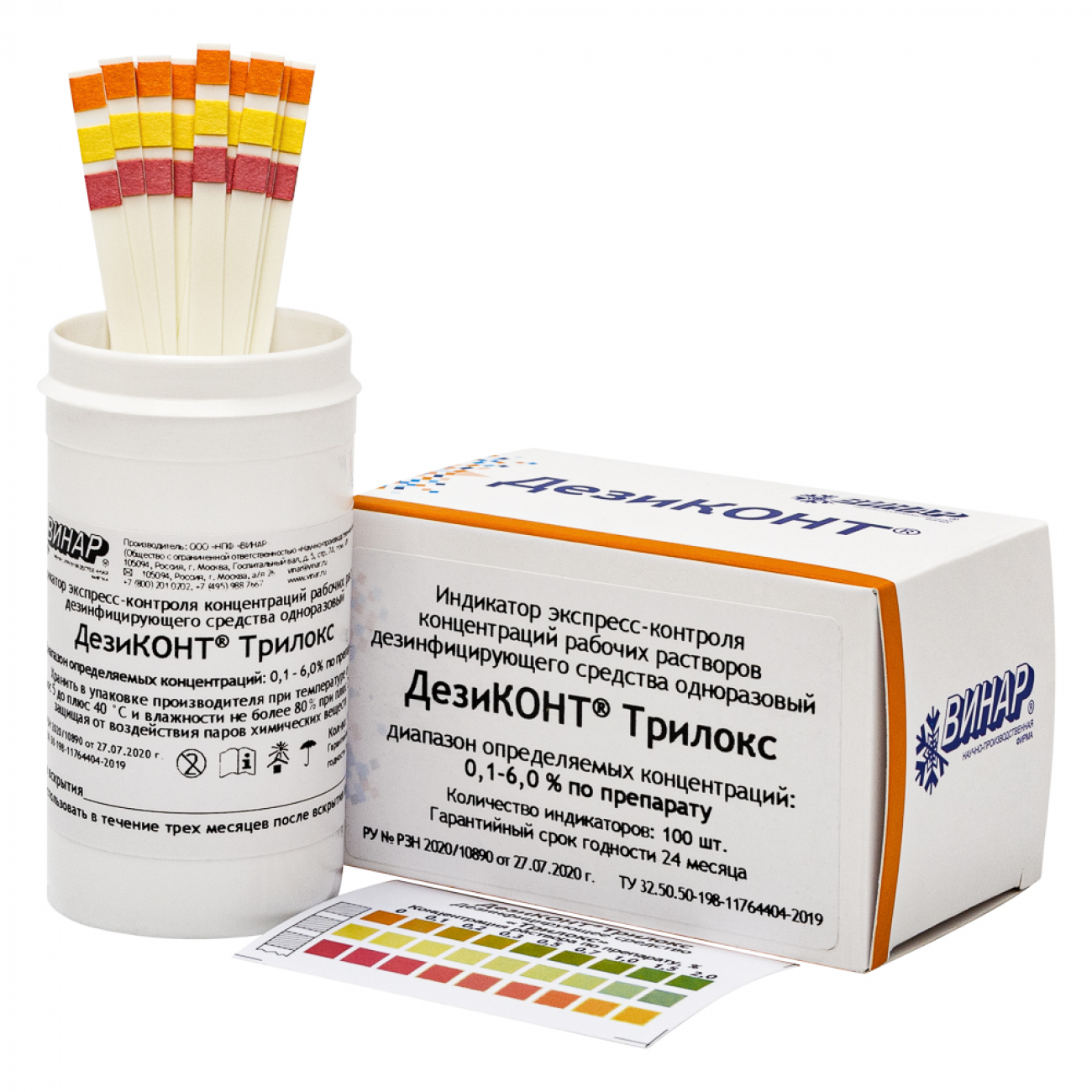 Индикаторные полоски представляют собой полимерные полоски размером 75x5 мм с закрепленными на конце 1-3 зонами индикаторных бумаг, расфасованные в пеналы по 100 шт. Полоски комплектуются инструкцией по применению, контрольными этикетками и элементом сравнения, на котором приведены определяемые концентрации действующих веществ. Срок хранения полосок в упаковке изготовителя составляет год и более.