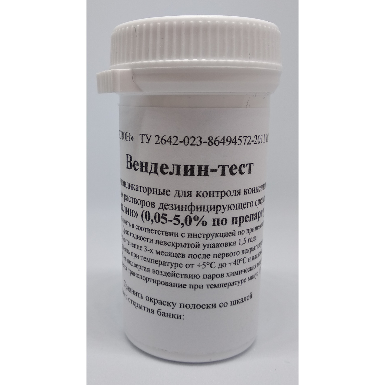 Полоски индикаторные "Тест-Венделин" для определения концентраций рабочих растворов дезинфицирующего средства "Венделин". В комплект входят: индикаторные полоски, инструкция по применению, банка, элемент сравнения (может быть нанесен на банку), контрольные этикетки, упаковочная коробка.