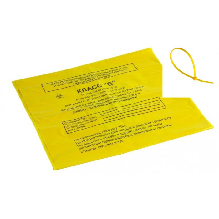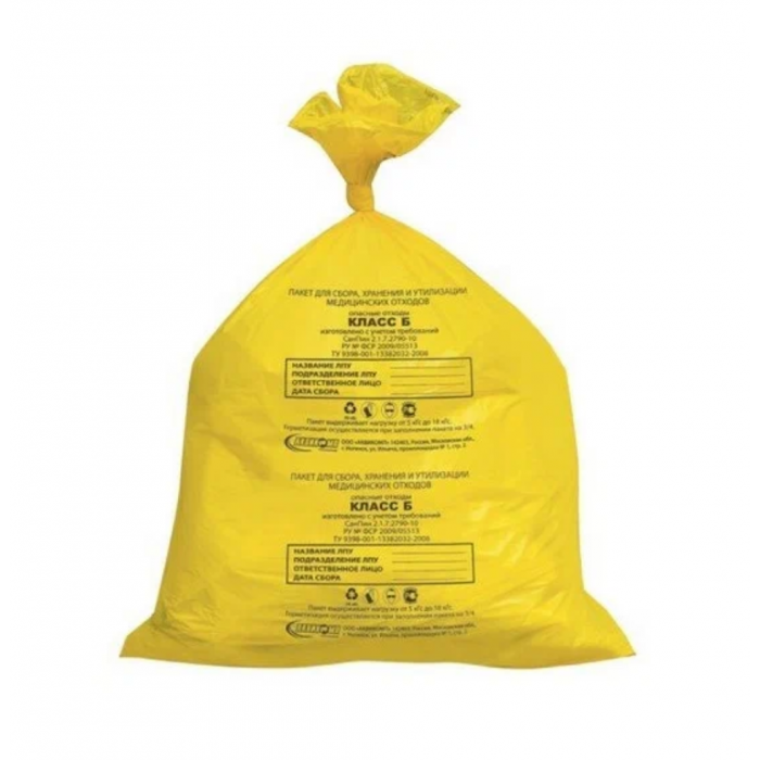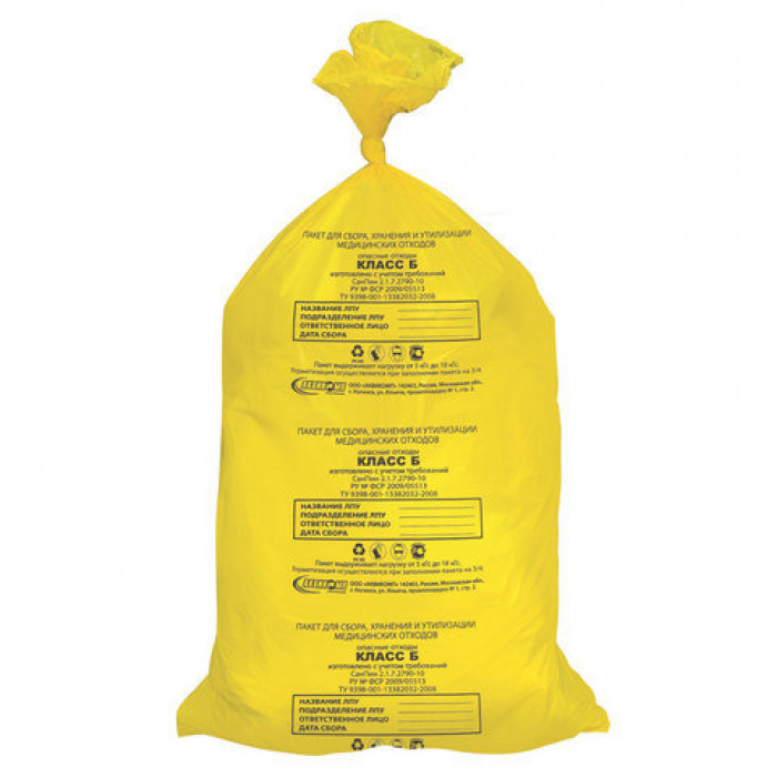 Пакет для медицинских отходов Класс Б Желтый (опасные) - применяются для утилизации мусора со степенью риска выше обычной, а также опасных отходов. К потенциально инфицированным относят: выделения пациентов, материалы и инструменты, загрязненные выделениями, в т.ч. кровью, патологоанатомические отходы. Желтые медицинские пакеты используют для сбора оставшихся после операций тканей и органов, мусора инфекционных отделений, вивариев, микробиологических лабораторий.