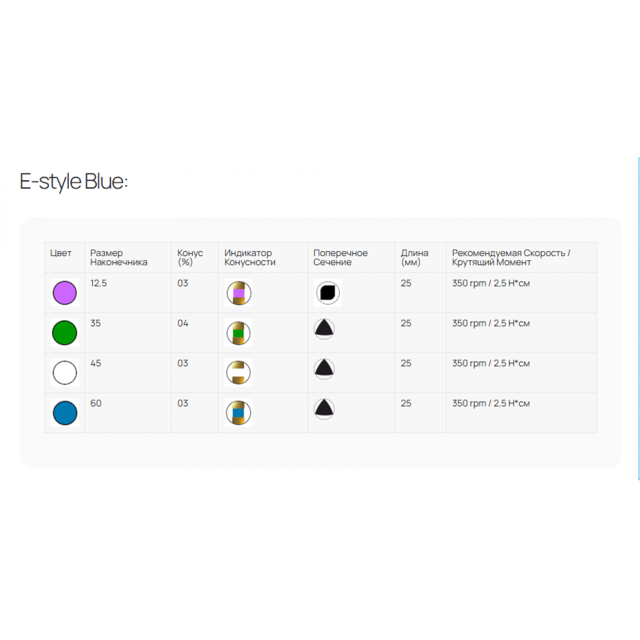 E-Style Blue — высокотехнологичный набор для более эффективного формирования каналов. Главное преимущество данного набора заключается в его меньшей закалке по сравнению с аналогами из золотого сплава. Это обеспечивает файлам великолепную гибкость и хорошую манёвренность, что делает их идеальными для сложных случаев, требующих повышенной точности. Благодаря уникальной технологии закалки, этот материал сочетает оптимальную гибкость и прочность, обеспечивая точность процедур. Файлы E-Style Blue созданы для финального этапа подготовки канала. Набор подходит для тщательной обработки разнообразных корневых каналов, обеспечивая идеальное прилегание и эффективность. Предварительное сгибание файлов улучшает доступ в труднодоступные области, делая выполнение работы комфортной.