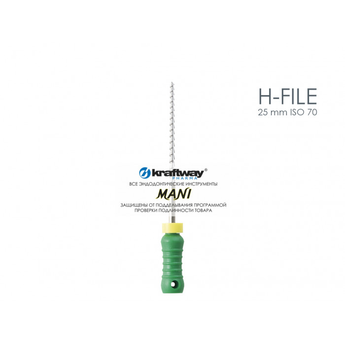 Ручной режущий стоматологический эндодонтический инструмент со спиральной нарезкой рабочей части. Материал рабочей режущей части - нержавеющая сталь, материал рукоятки – пластик (полибутилентерефталат).