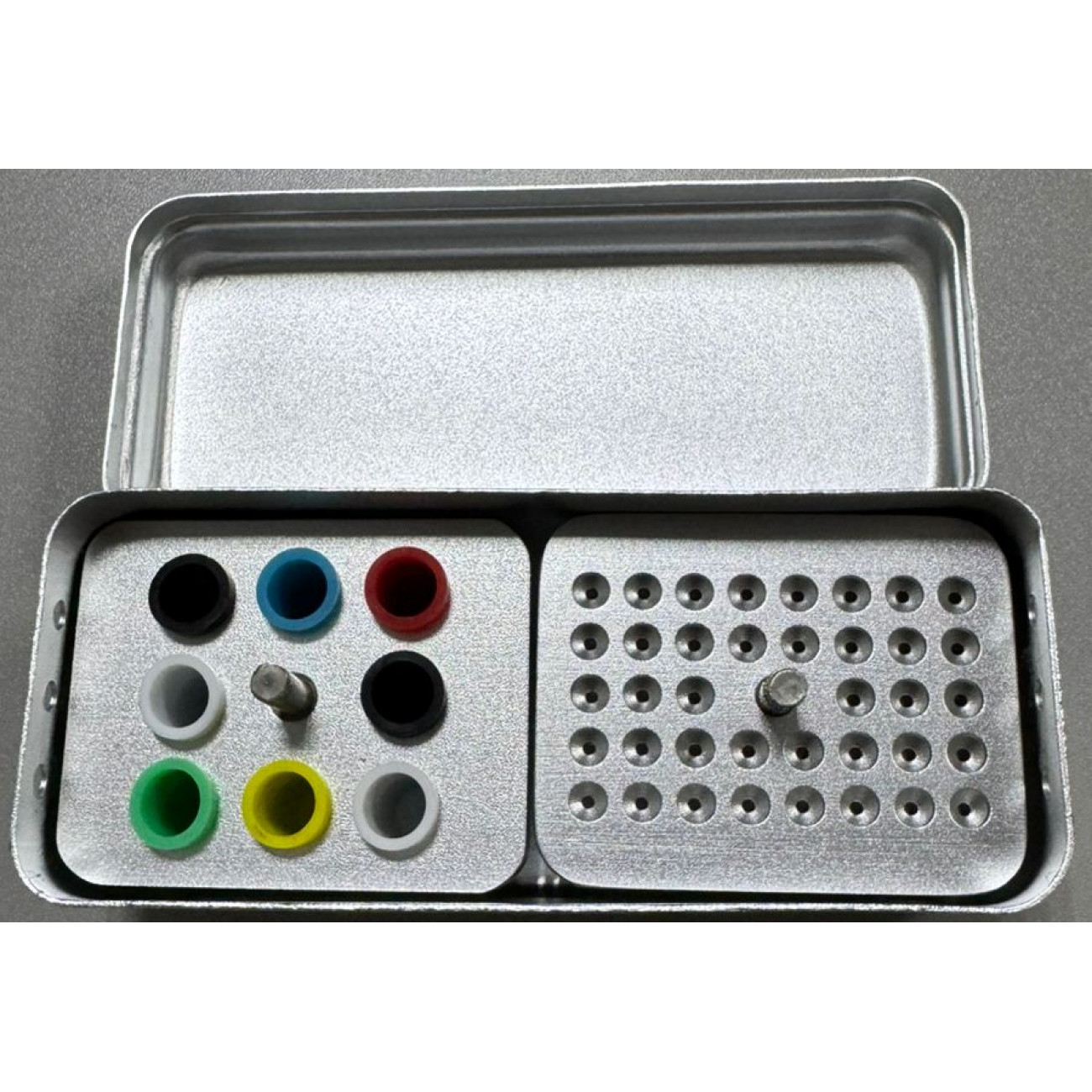 Стоматологический эндобокс с 38 отверстиями и 8 дополнительными цветными емкостями предназначен для автоклавирования ручных эндодонтических файлов и штифтов при температуре до 135 °C.