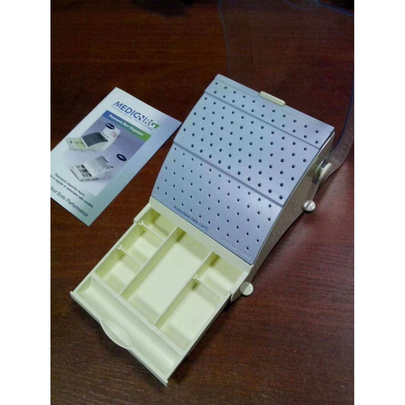 Панорамный стенд с крышкой для хранения турбинных, угловых и прямых боров, а также мелких стоматологических принадлежностей.