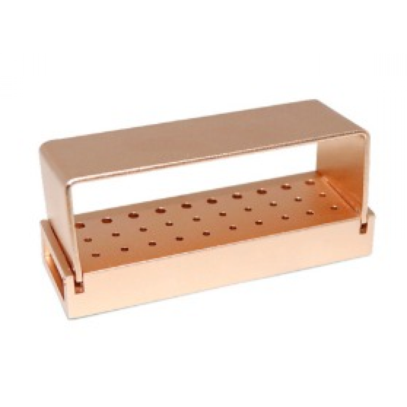 Металлический автоклавируемый термоблок на 30 отверстий предназначен для хранения и температурной стерилизации боров типа FG для турбинных стоматологических наконечников, а также боров RA для угловых наконечников. Для более надежного удержания боров с коротким хвостовиком термоблок оснащен вставками из термоустойчивого силикона.