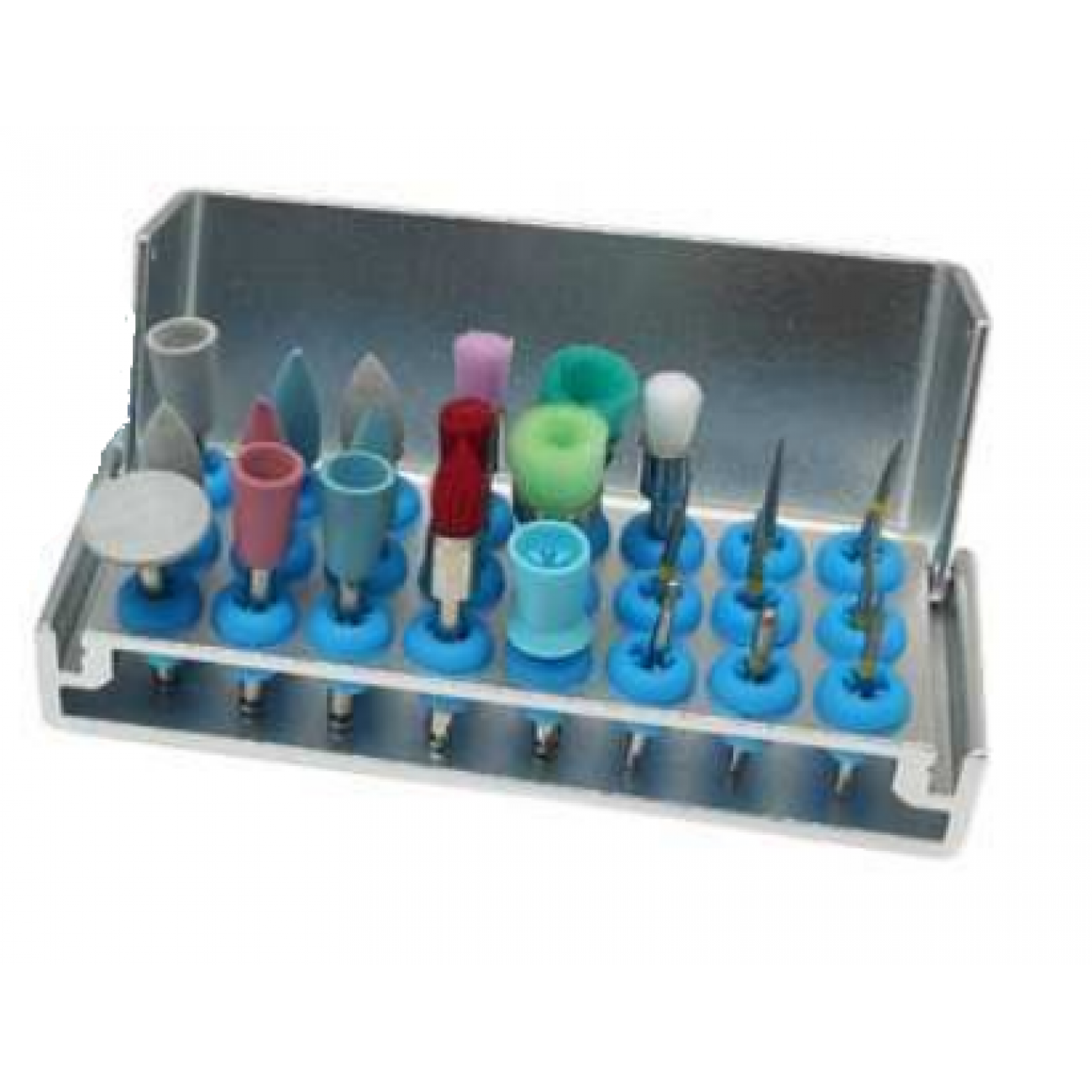 Металлический автоклавируемый термоблок на 24 отверстия предназначен для хранения и температурной стерилизации боров типа FG для турбинных стоматологических наконечников, а также боров RA для угловых наконечников. Для более надежного удержания боров с коротким хвостовиком термоблок оснащен вставками из термоустойчивого силикона.