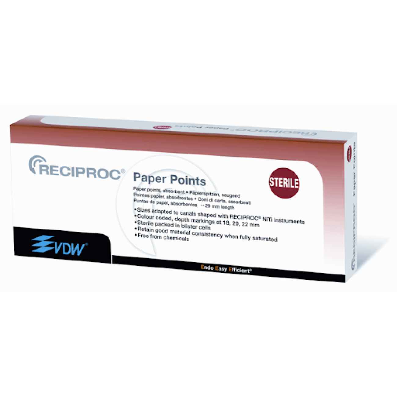 Для удобства использования бумажные штифтыRECIPROC® упакованы в блистеры по 4 штифта каждый; штифты стерилизованы промышленным методом для более качественного инфекционного контроля.