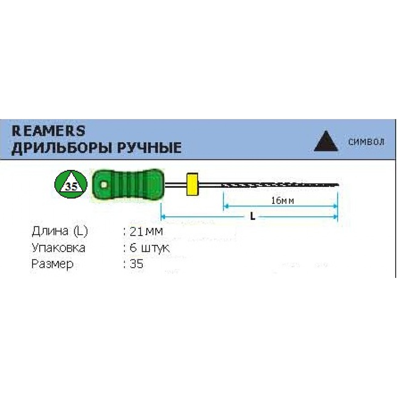 Ручной режущий стоматологический эндодонтический инструмент со спиральной нарезкой рабочей части. Материал рабочей режущей части - нержавеющая сталь, материал рукоятки – пластик (полибутилентерефталат). Шаг режущих граней увеличен, что повышает режущую способность.