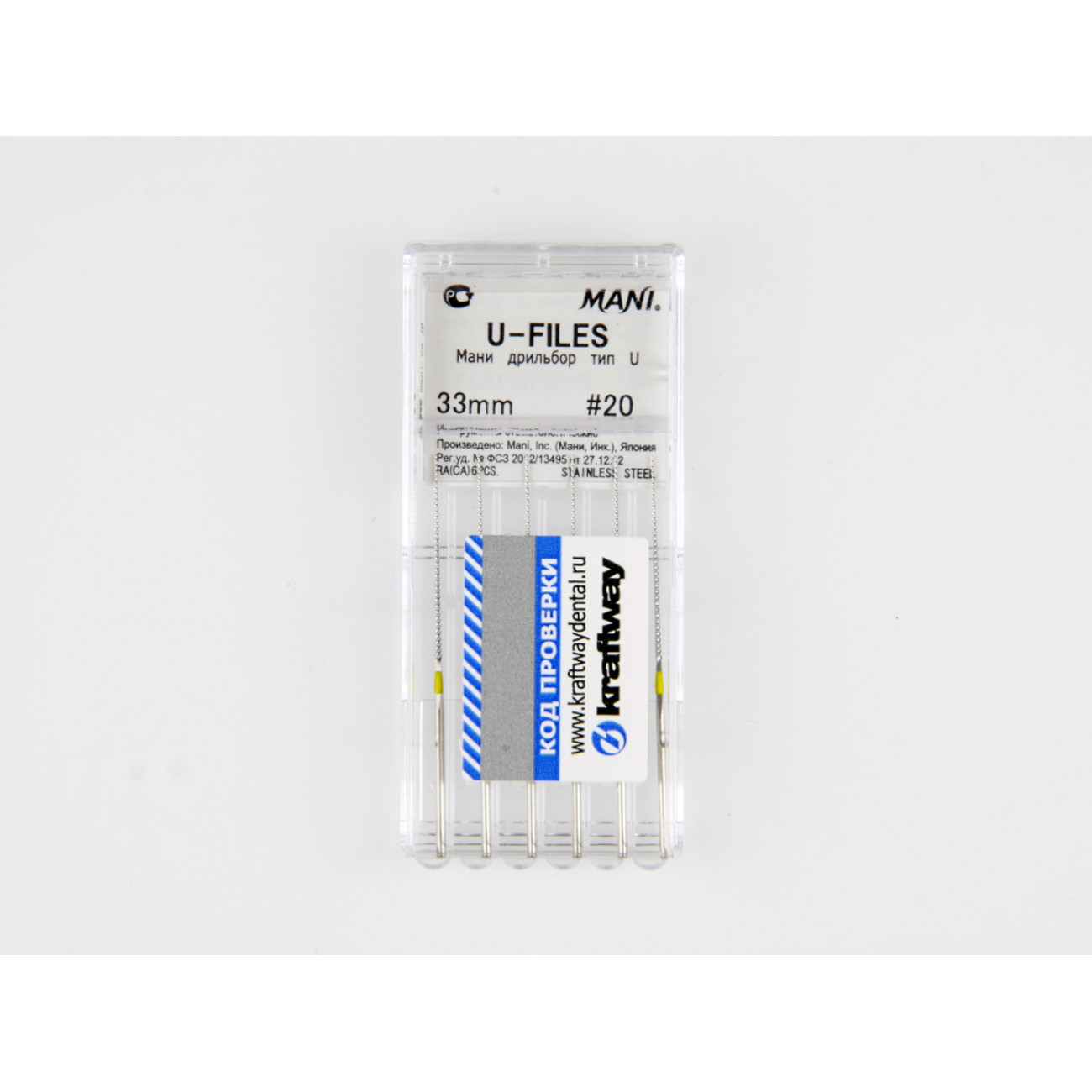 Mani U-Files - Машинный режущий стоматологический эндодонтический инструмент со спиральной нарезкой рабочей части. Инструмент предназначен для использования в ультразвуковых наконечниках бормашин. Материал рабочей режущей части - нержавеющая сталь, материал хвостовика – нержавеющая сталь.