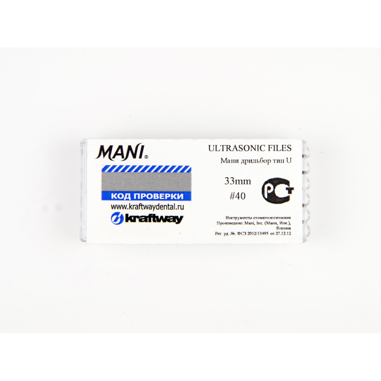 Mani U-Files - Машинный режущий стоматологический эндодонтический инструмент со спиральной нарезкой рабочей части. Инструмент предназначен для использования в ультразвуковых наконечниках бормашин. Материал рабочей режущей части - нержавеющая сталь, материал хвостовика – нержавеющая сталь.