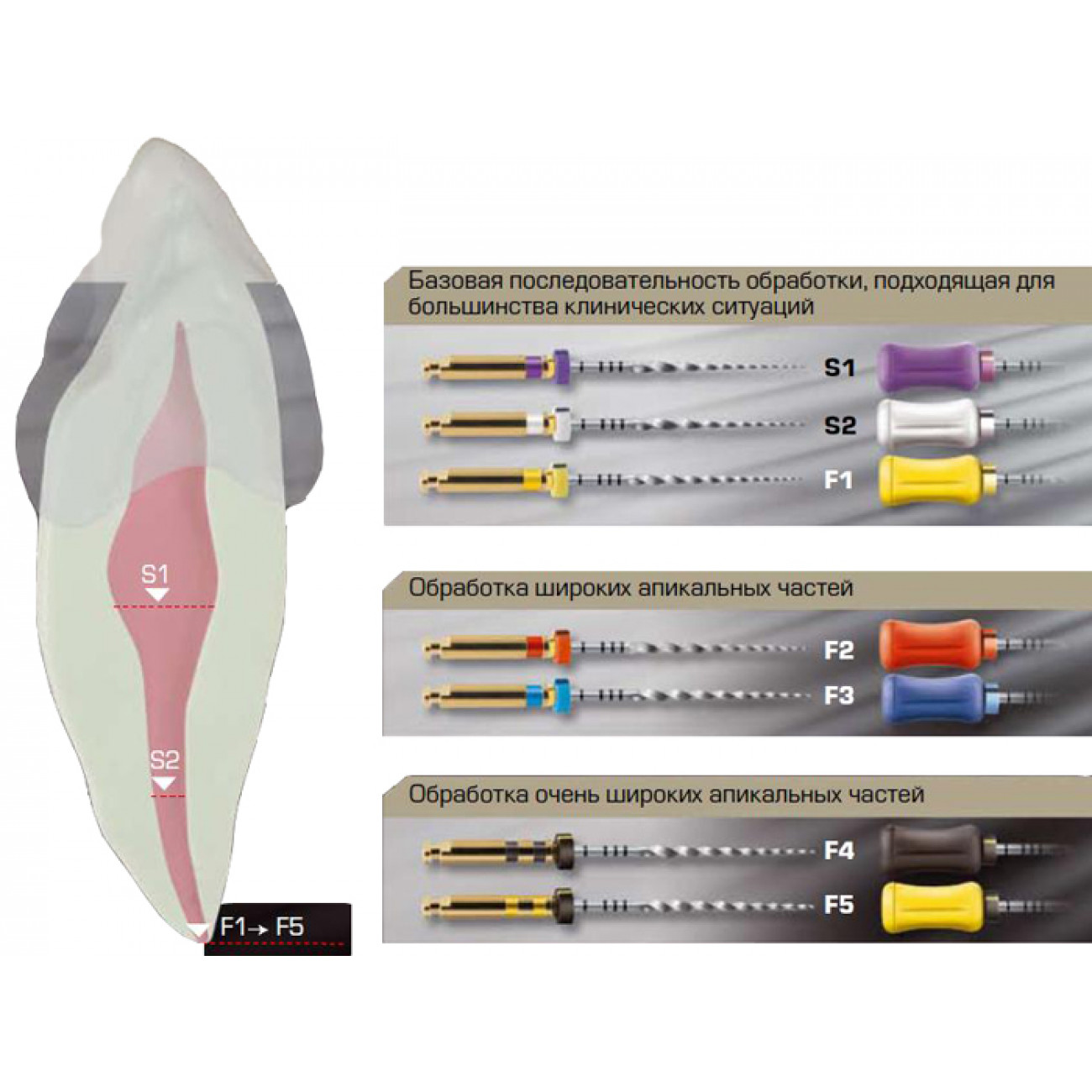 •Единая последовательность инструментов вне зависимости от формы корневого канала;