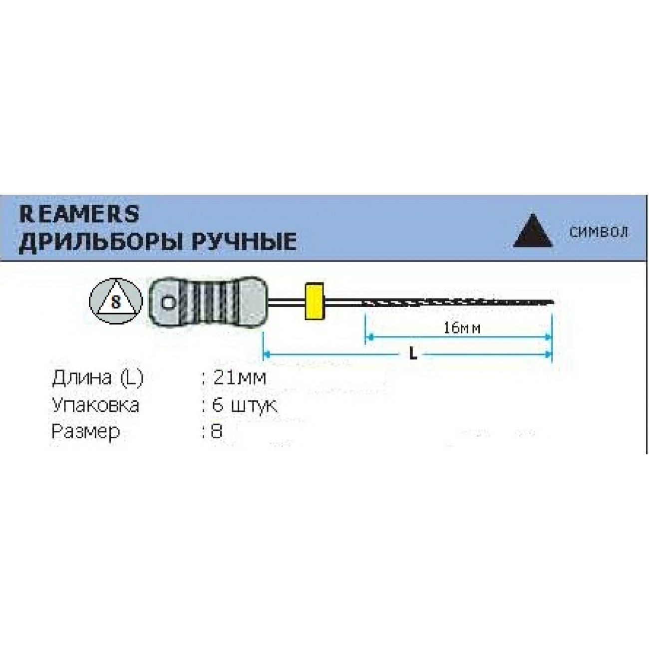 Ручной режущий стоматологический эндодонтический инструмент со спиральной нарезкой рабочей части. Материал рабочей режущей части - нержавеющая сталь, материал рукоятки – пластик (полибутилентерефталат). Шаг режущих граней увеличен, что повышает режущую способность.