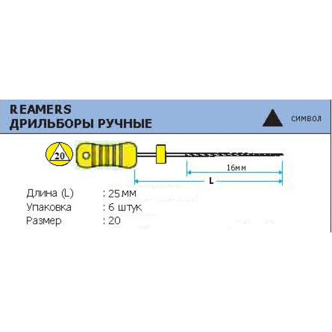 Ручной режущий стоматологический эндодонтический инструмент со спиральной нарезкой рабочей части. Материал рабочей режущей части - нержавеющая сталь, материал рукоятки – пластик (полибутилентерефталат). Шаг режущих граней увеличен, что повышает режущую способность.