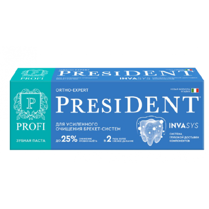 Ортодонтическая зубная паста для брекетов ПрезиДЕНТ Профи Орто-Эксперт (PresiDENT PROFI ORTHO-EXPERT) эффективно удаляет налет, борется с воспалением и восстанавливает защитные свойства слюны у пациентов с ортодонтическими брекет-системами. Применение пасты с морской коллагеназой и NA РСА значительно улучшает состояние полости рта уже через один месяц - эффективность PresiDENT PROFI ORTHO-EXPERT подтверждена клиническими исследованиями!