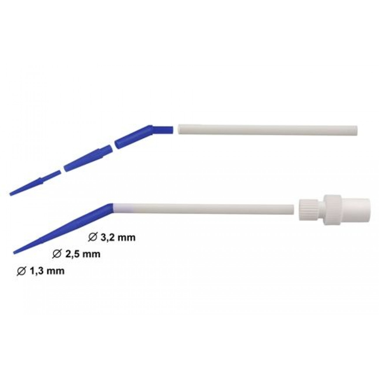 Состоит из белой пластиковой трубки с наружным диаметром 6,5 мм и 3-х вставленных друг в друга полых синих пластиковых насадок (канюль).