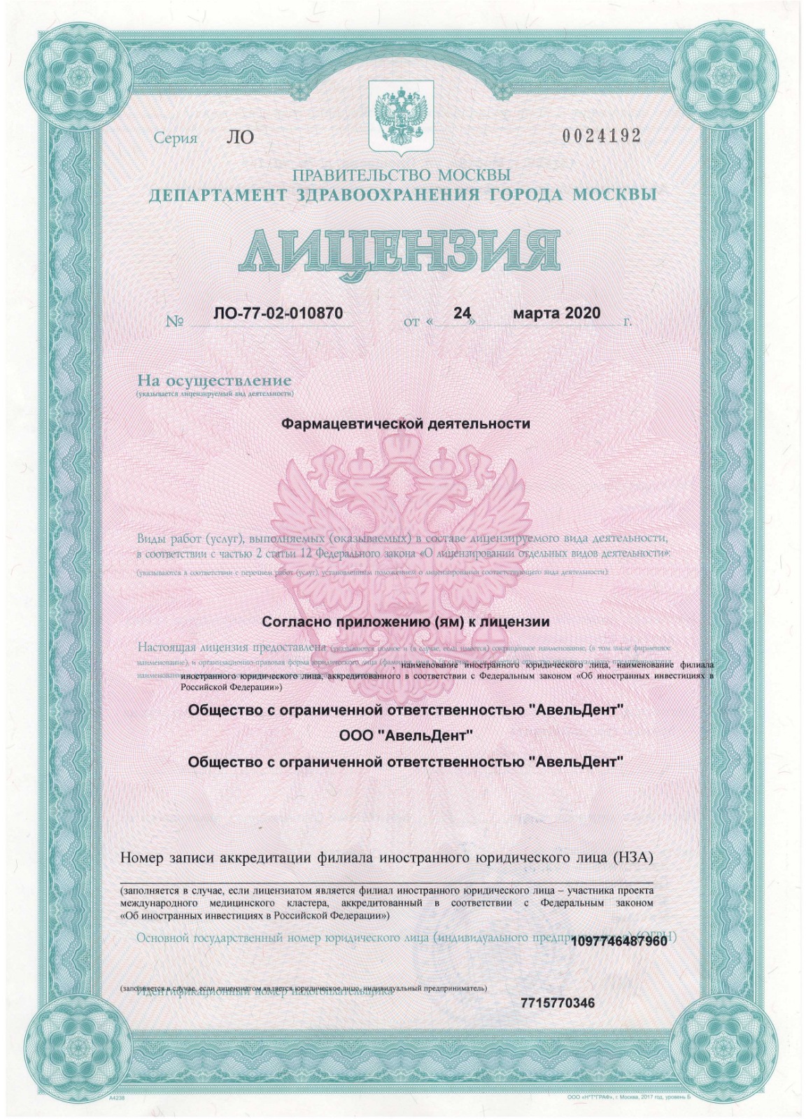 Лицензия на фармацевтическую деятельность: № ЛО-77-02-010870