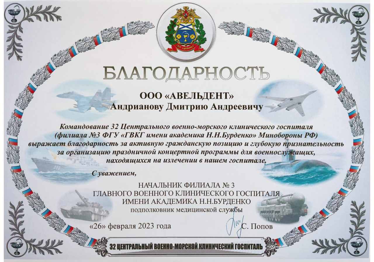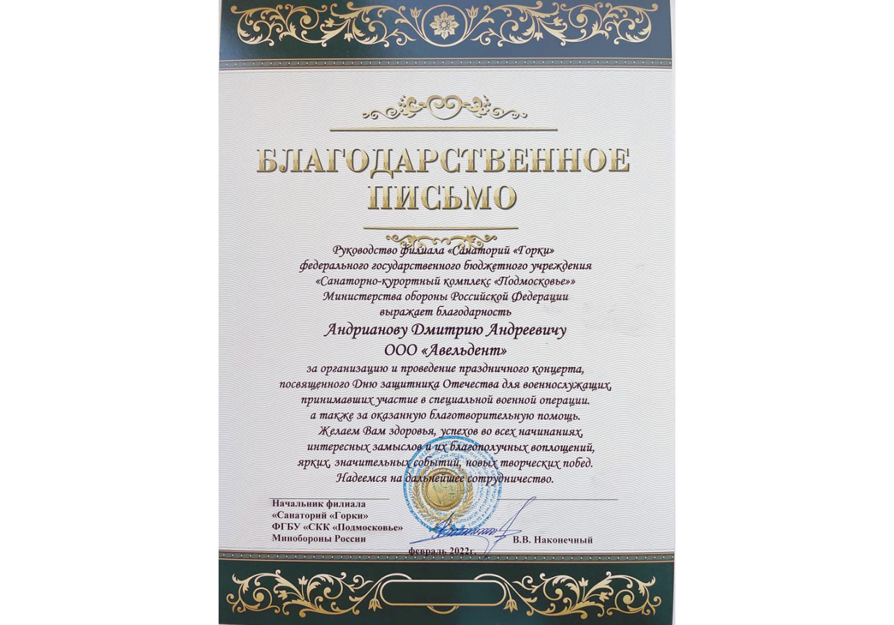 Накануне 23 февраля наша компания поздравила военнослужащих, находящихся на лечении в Главном военном клиническом госпитале им. академика Н. Н. Бурденко и в филиале «Санаторий «Горки» ФГБУ СКК «Подмосковье» МО РФ с их профессиональным праздником. Благодаря волонтерам, с которыми мы уже сотрудничали и оказали гуманитарную помощь стоматологам ЛНР, нам удалось передать скромные, но необходимые подарки. Кроме того, для бойцов были организованы праздничные концерты в честь Дня защитника отечества.