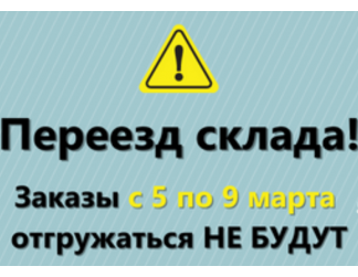 В связи с переездом нашего склада отгрузка заказов с 5 по 9 марта (включительно) производиться НЕ БУДЕТ.