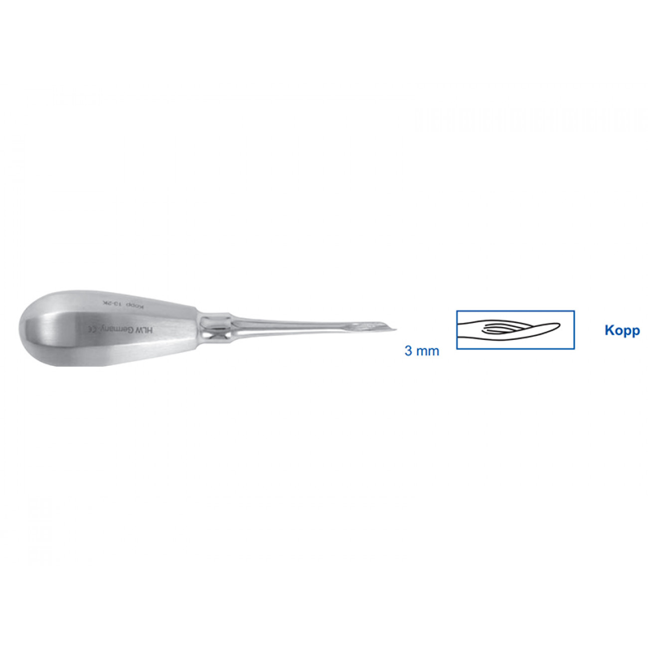 В ассортименте представлены различные размеры элеваторов Kopp, включая размер 3,0 мм. При выборе инструмента необходимо учитывать размер корня зуба, который предстоит удалить.