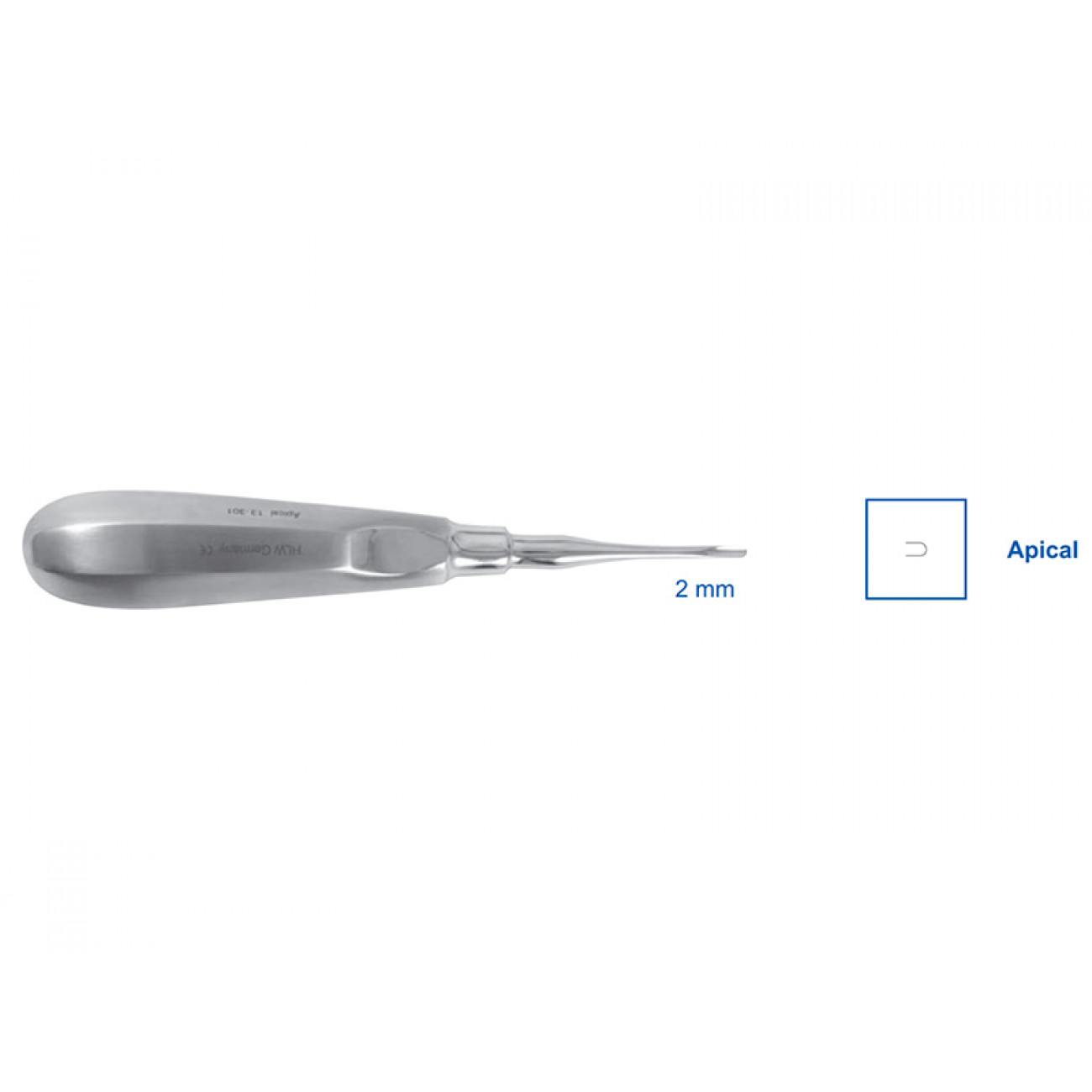 Элеватор апикальный 13-301, 2.0 мм — это инструмент, который используется в стоматологии для удаления корней зубов или их фрагментов. Он относится к категории элеваторов, которые предназначены для хирургического вмешательства в области верхушки зуба.