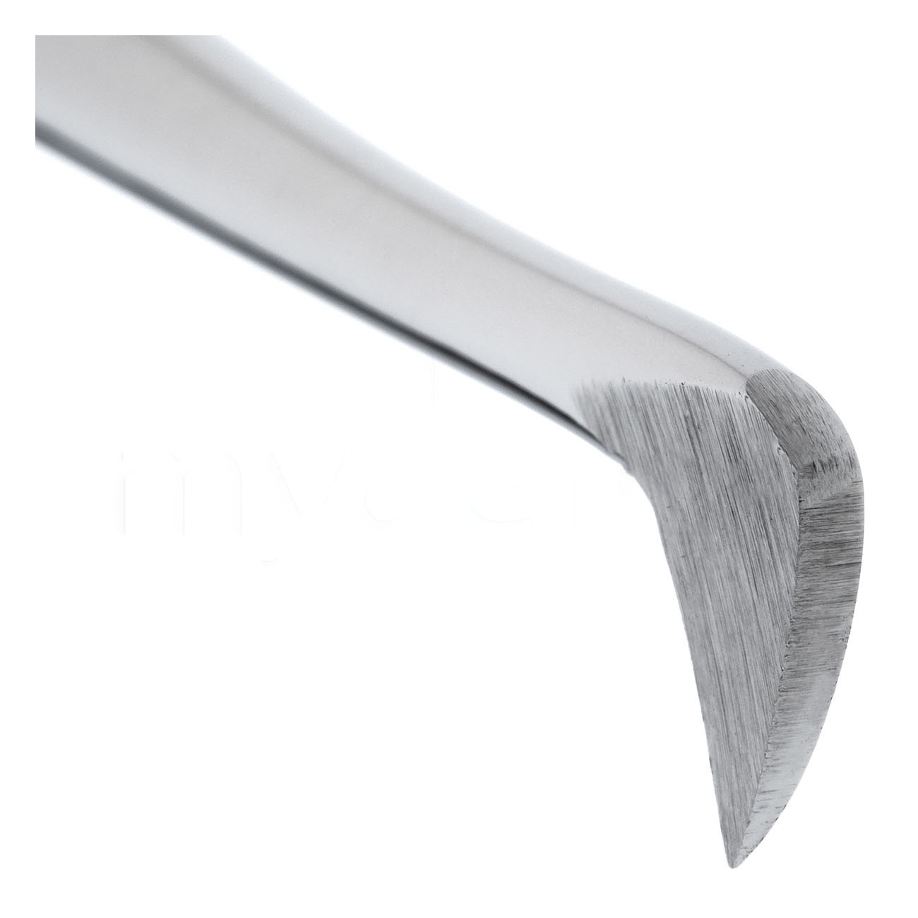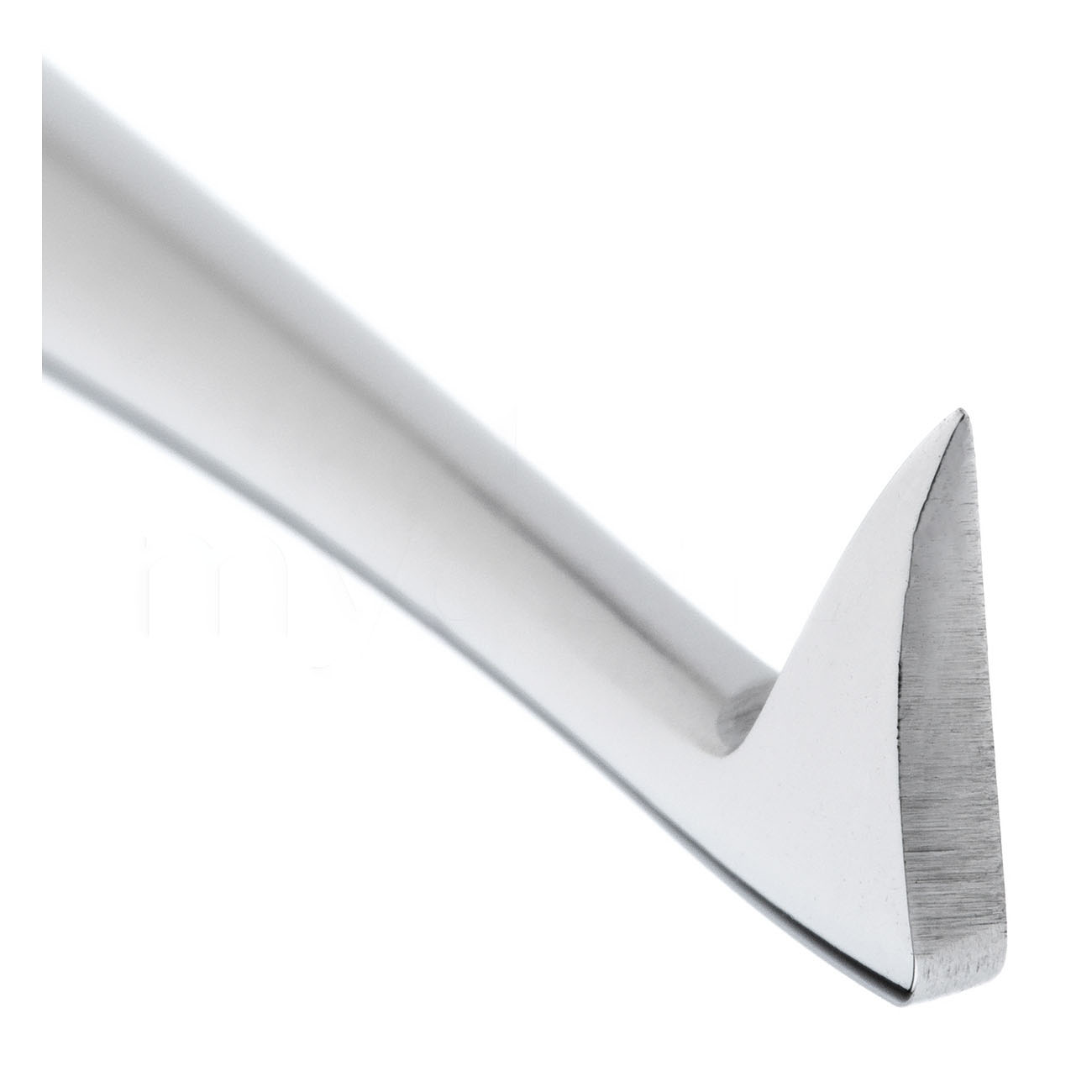 Инструмент оснащен треугольной рабочей частью с заостренным кончиком, форма которой способствует легкому введению элеватора в альвеолярное гнездо и быстрому нахождению опорной точки. Угловой элеватор придает зубам сильное вращательное движение, достаточное для неосложненного удаления большинства корней.
