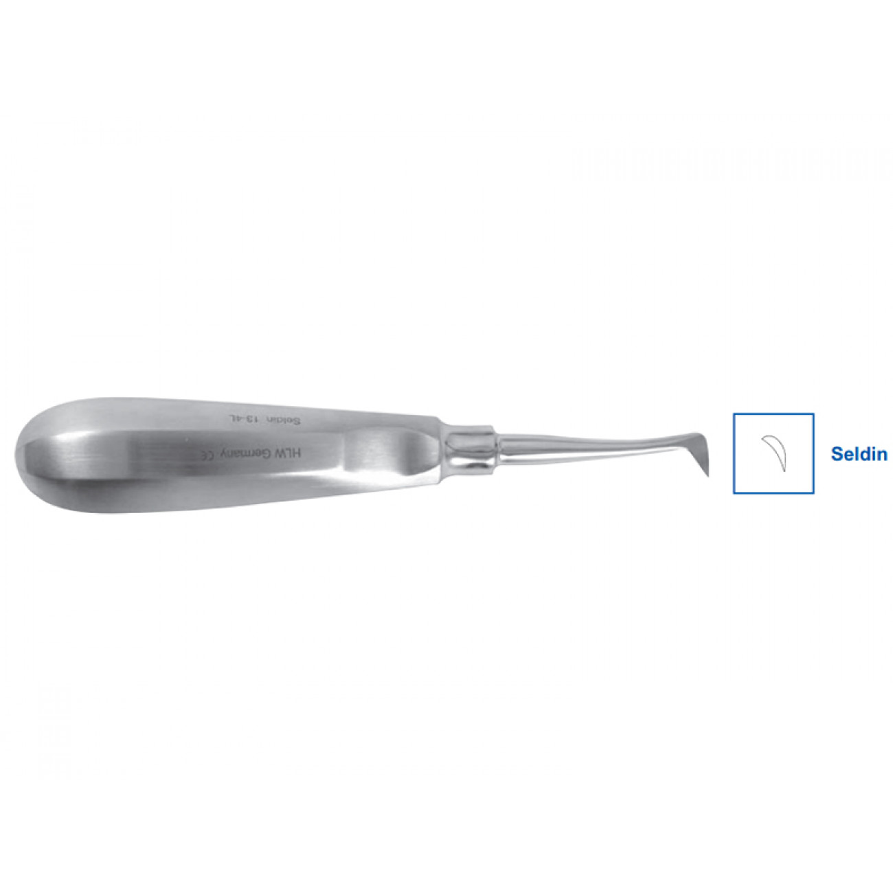 Малый угловой элеватор-флажок 13-4L Seldin длиной 10 мм предназначен для люксации и удаления разъединенных корней моляров верхней и нижней челюсти, а также зубов с обильными повреждениями коронковой части.