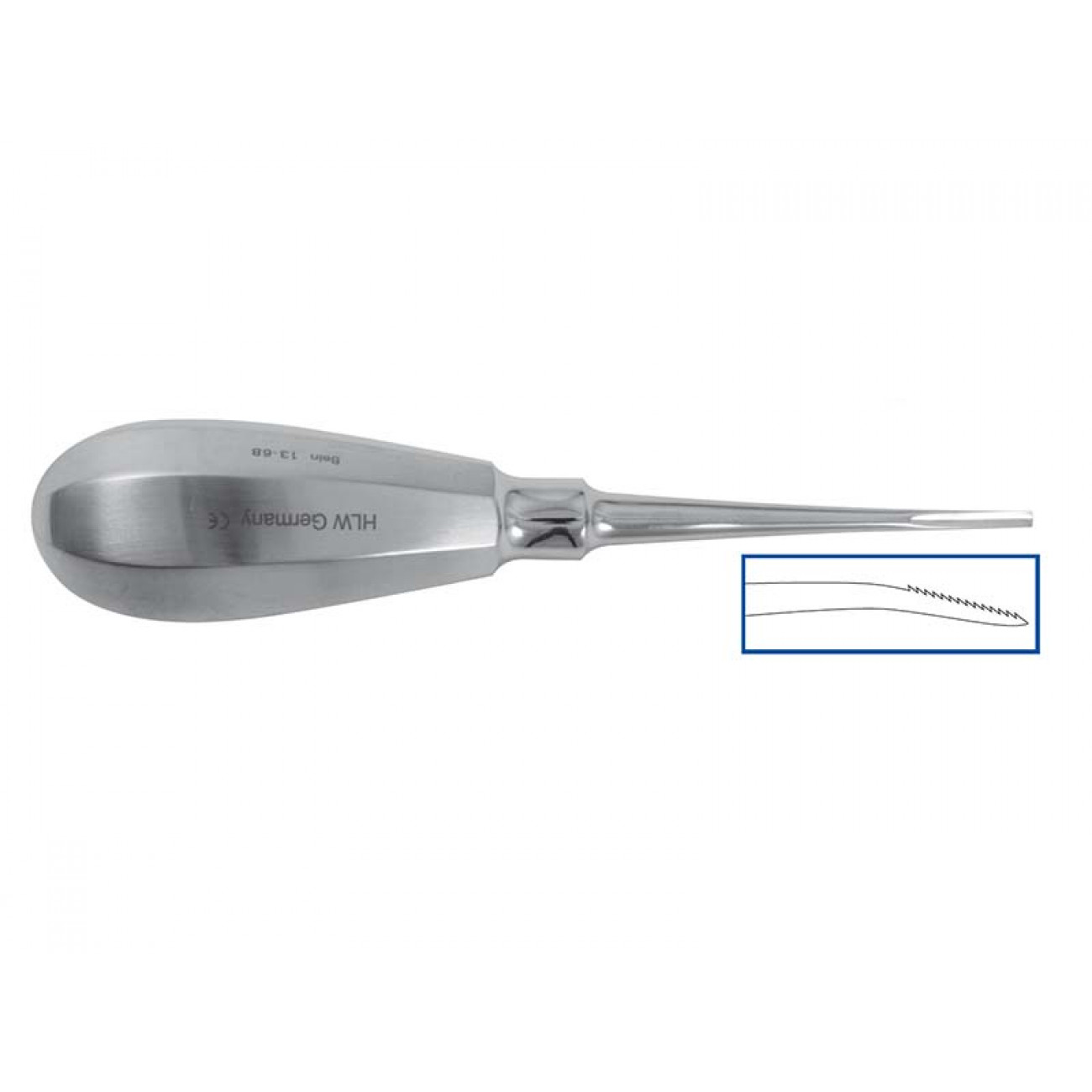 Назначение: предназначен для удаления зубов, особенно в случаях, когда использование других инструментов затруднено или невозможно. Изогнутая форма позволяет элеватору легко проникать в труднодоступные места и эффективно удалять корни зубов.