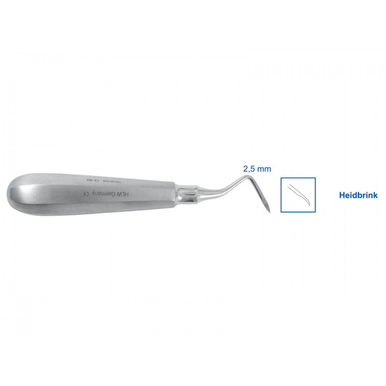 "Элеватор Heidbrink 13-8H, левый, 2,5 мм" — это высококачественный инструмент, предназначенный для использования в стоматологии. Он относится к категории элеваторов и люксаторов, которые широко применяются в эндодонтическом лечении.