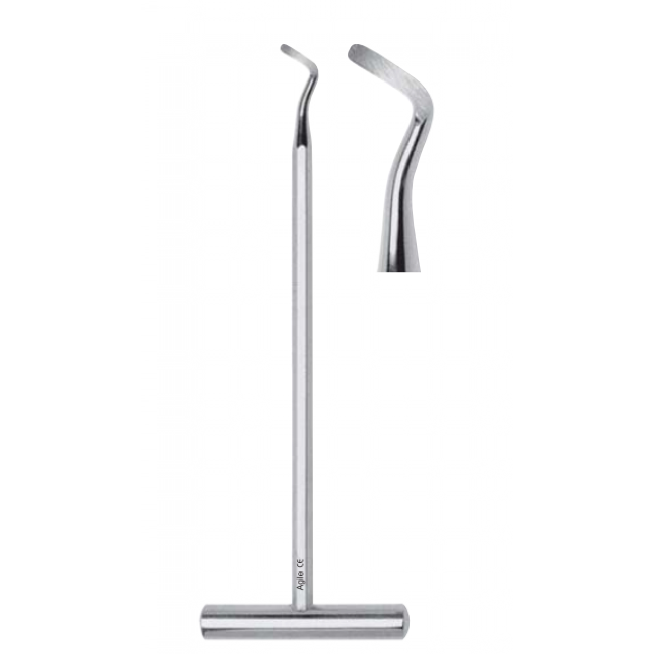 Изогнутый левосторонний элеватор Potts с Т-ручкой предназначен для атравматичной люксации и удаления корней, плотно стоящих третьих моляров и других скученных зубов при отсутствии осложнений и помех в виде аномалий костных тканей. Тонкая рабочая часть на длинном стебле без труда проникает в глубину полости рта, позволяя провести рассечение периодонтальной связки без лишних проблем.