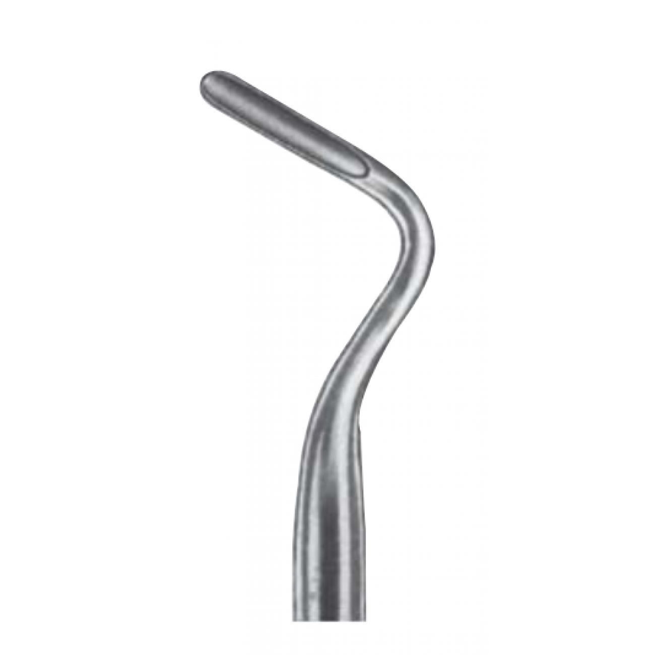 Апикальный элеватор оснащен длинной рабочей частью с желобком и острой кромкой, способной проникнуть в зубную лунку на всю глубину. Изогнутая форма элеватора подходит для неосложненного удаления большинства корней при помощи вращательных движений.
