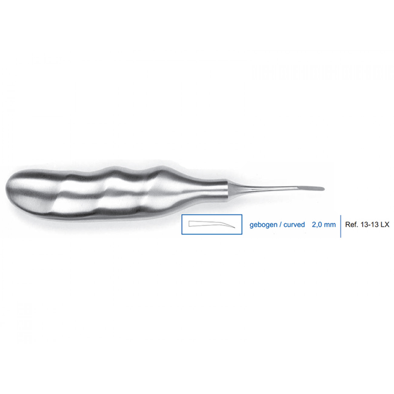Люксатор 13-13LX — это изогнутый люксатор с рабочей частью диаметром 2,0 мм, предназначенный для использования в стоматологии.
