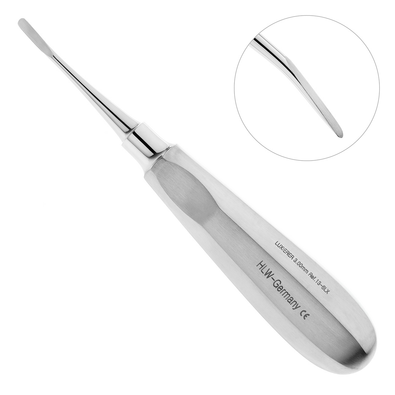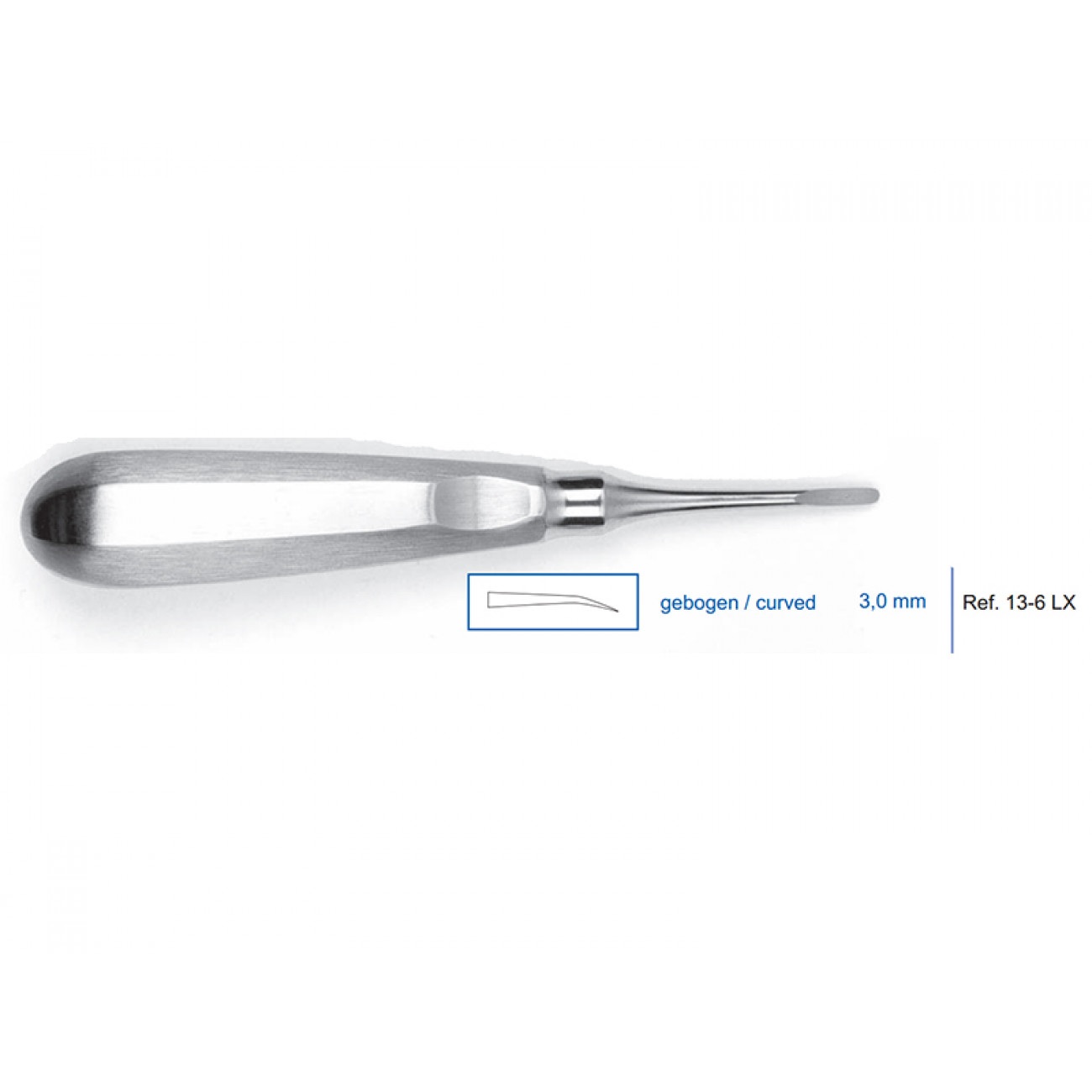 Люксатор изогнутый 13-6LX, 3,0 мм — это стоматологический инструмент, который применяется для удаления зубов или их корней.