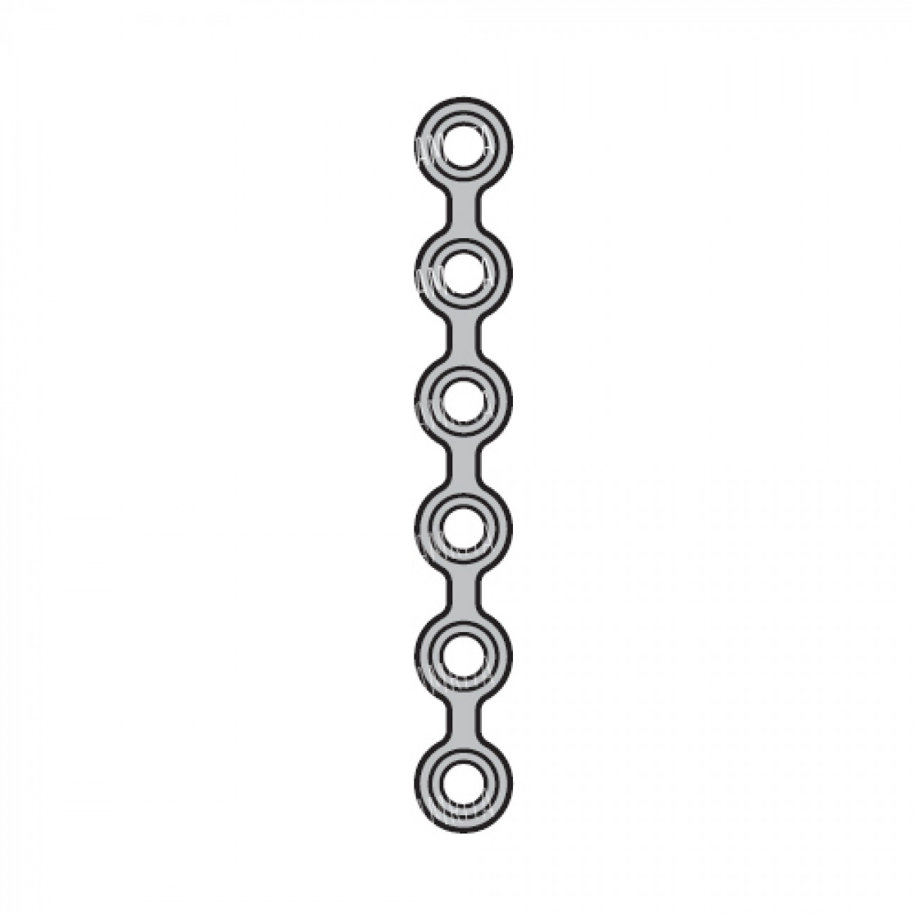 Микропластина прямая Конмет толщиной 0,6 мм изготовлена из титана, имеет 6 отверстий и применяется для черепно-челюстно-лицевого остеосинтеза и костной пластики.